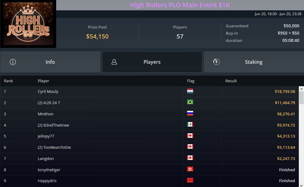 Den Sieg beim $1.000 PLO Main Event trug „Cyril Mouly“ davon, doch da der Spieler aus den Niederlanden stammt, ist davon auszugehen, dass es sich nicht um den berühmten französischen Fisch handelt, der einst die Highstakes-Runden von Las Vegas beglückte.