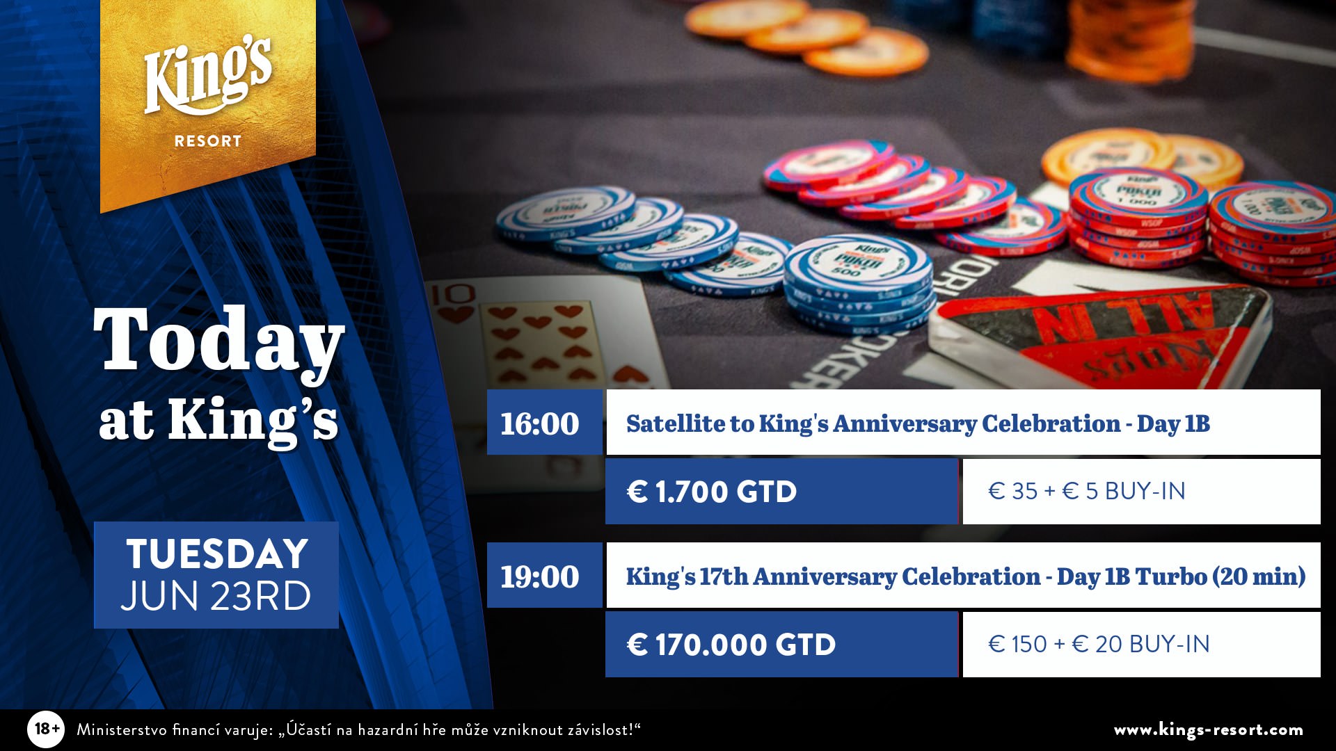 Der zweite von insgesamt neun Starttagen Eins des €150+€20 King’s 17th Anniversary Celebration Events, startet um 19:00 Uhr. Bei dem Turnier wird ein Preisgeld von €170.000 (inklusive zwei €10.350 WSOP Europe Main Event Tickets Tag 1a) garantiert. Es geht los mit 40.000 in Chips und es werden 18 Levels à 20 Minuten gespielt. Zwei Re-Entries sind möglich und die Late-Registration ist für zehn Level geöffnet.