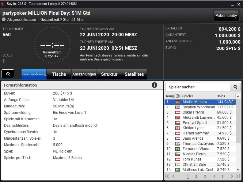 Nach diversen Starttagen Eins, über die vergangene Woche verteilt, kamen schließlich 4.471 Entries bei der $215 partypoker MILLION Online zusammen und partypoker musste ein deutliches Overlay von $105.800 hinnehmen. Ins Finale hatten es 560 Online-Cracks geschafft und spielen um ihren Anteil am $1.000.000 großen Preispool. Kurz vor dem Final Table musste sich der Österreicher Tom Kunze auf Platz 12 für $7.520 verabschieden. Harald Sammer (AUT) schaffte es sogar an den Final Table und wurde Siebter für $14.950. Knapp das Heads-Up verpasste Oskar Prehm (AUT). Für Platz 3 wurde er mit $69.600 entlohnt. Im Heads-Up konnte sich dann der Deutsche Martin Mulsow gegen den Briten Stephen Woodhead durchsetzen und den Sieg samt $144.948 abräumen.