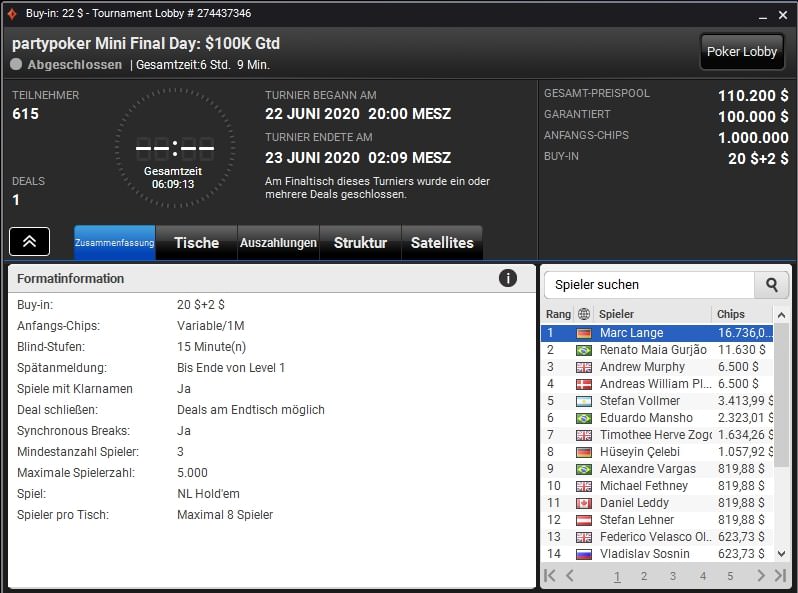 Außerdem gab es noch das Finale des $22 partypoker Mini Events. Hier konnte man mit 5.511 Entries die Garantiesumme sprengen und es wurden $110.200 ausgespielt. Der Deutsche Hüseyin Celebi belegte hier einen starken Platz 8 für $1.056. Marc Lange (GER) konnte sich am Ende behaupten und ein Preisgeld von $16.736 für den Sieg kassieren.