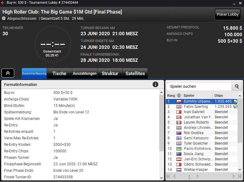 Die deutschsprachigen Pokerspieler gingen bei den genannten Turnieren komplett leer aus, aber zumindest vom $530 The Big Game Phasenturnier gibt es eine gute Nachricht zu vermelden. Fabio Sperling qualifizierte sich zusammen mit dem Polen Dzmitry Urbanovich für das $5.200 Endturnier mit einem garantierten Preispool in Höhe von $1 Million am kommenden Sonntag.