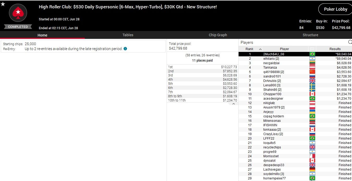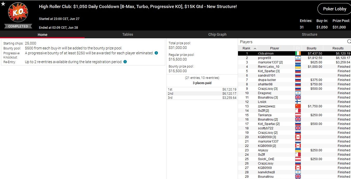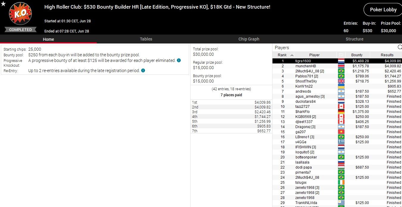 Größter Gewinner des Tages war der Niederländer „BRzRoll“, der sich das $530 Bounty Builder unter den Nagel riss.