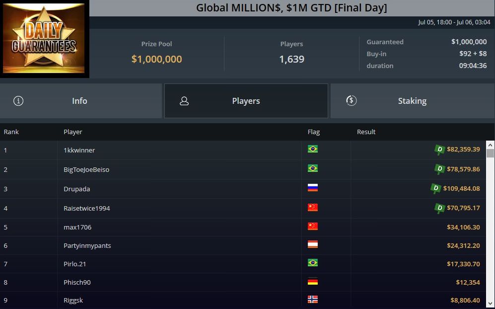 Einen Four-Way-Deal gab es bei der $100 Global MILLION$. Alle Beteiligten durften sich über mindestens $70.000 freuen, der Russe „Drupada“ kassierte als Dritter sogar eine sechsstellige Summe.