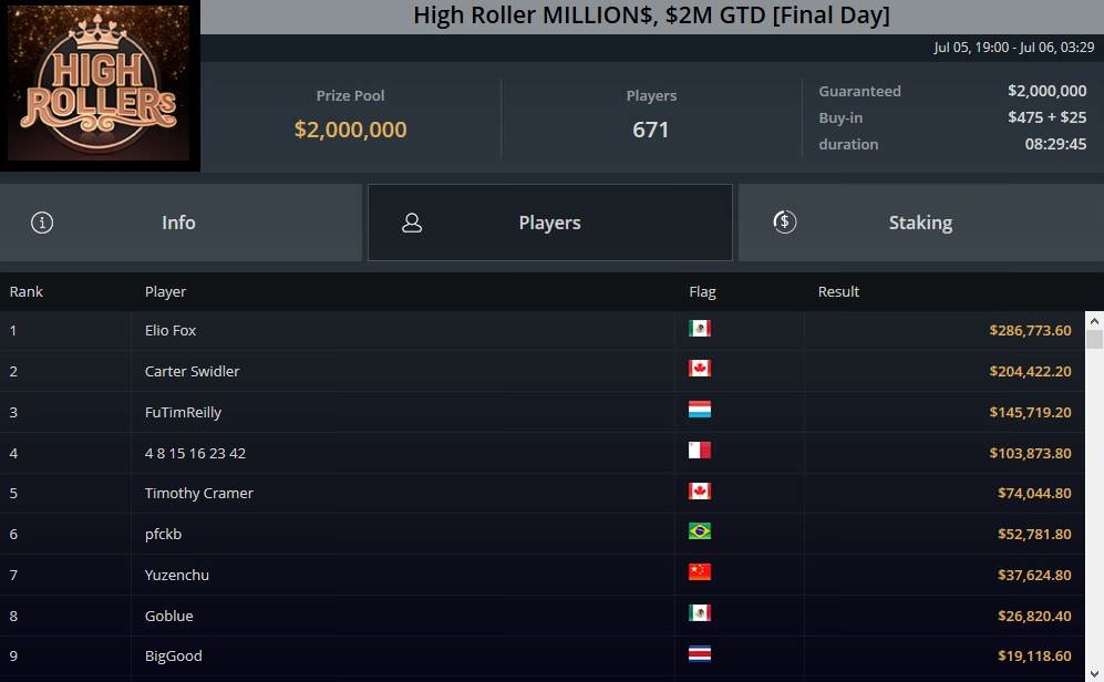 Den begehrten Sieg bei der High Roller MILLION$ mit einem Startgeld von $500 und einer Garantie von $2 Millionen holte sich dabei der US-Amerikaner Elio Fox.