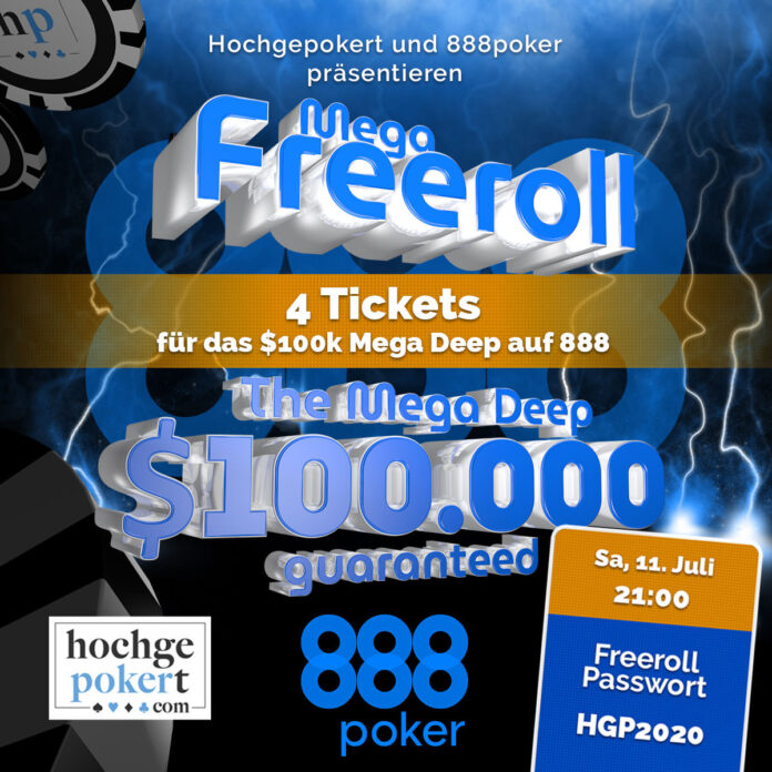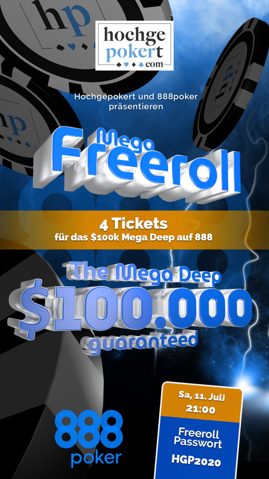 888poker und Hochgepokert präsentieren euch das exklusive Hochgepokert.com Freeroll auf 888poker. Hier könnt ihr euch komplett kostenlos, eins von vier garantierten $55 Tickets für das $100.000 GTD „The Mega Deep“ Event erspielen.