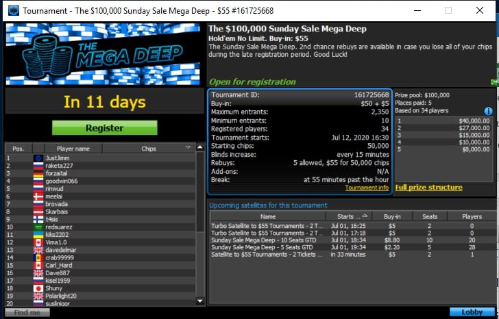Das $55 „The $100.000 Sunday Sale Mega Deep“ Turnier findet am Sonntag den 12. Juli 2020 ab 21:00 Uhr auf 888poker statt. Hier geht es mindestens um $100.000.