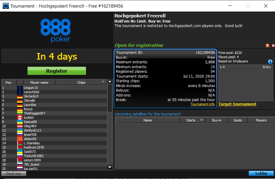 Das HGP-Freeroll findet am Samstag den 11. Juli 2020 um 21:00 Uhr auf 888poker statt. Die Anmeldung ist ab sofort möglich. Ihr findet das Turnier in der 888poker Lobby unter TURNIERE – RESTRICTED (Satellitenturniere anklicken).