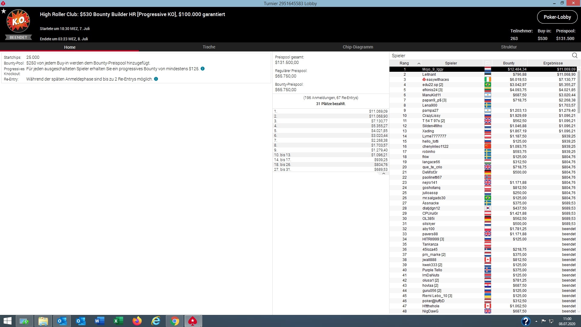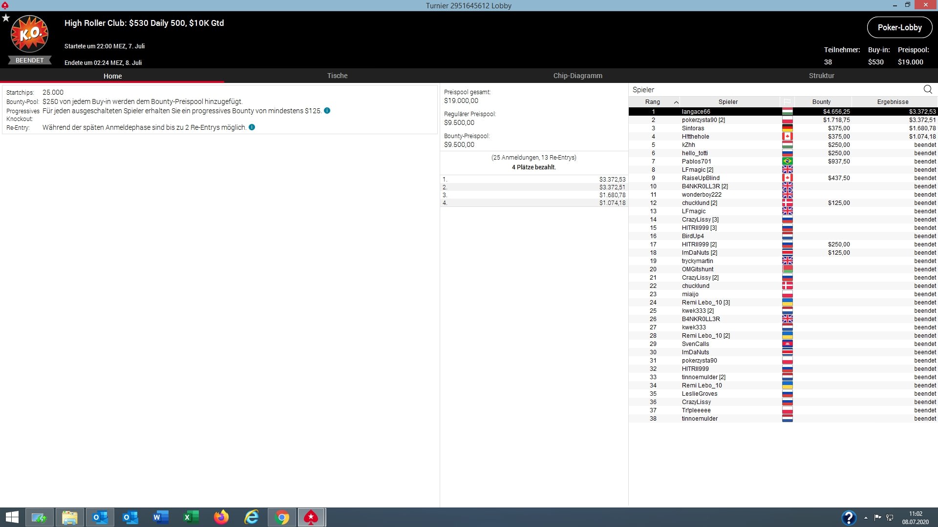 Das $530 Daily 500 lockte 38 Online-Grinder an und so ging es um $19.000. Der Deutsche „Sintoras“ holte sich Platz 3 für $1.680 + $375 Bounties. Der Sieg ging für $3.372 + $4.656 Bounties nach Ungarn an „langace66“.