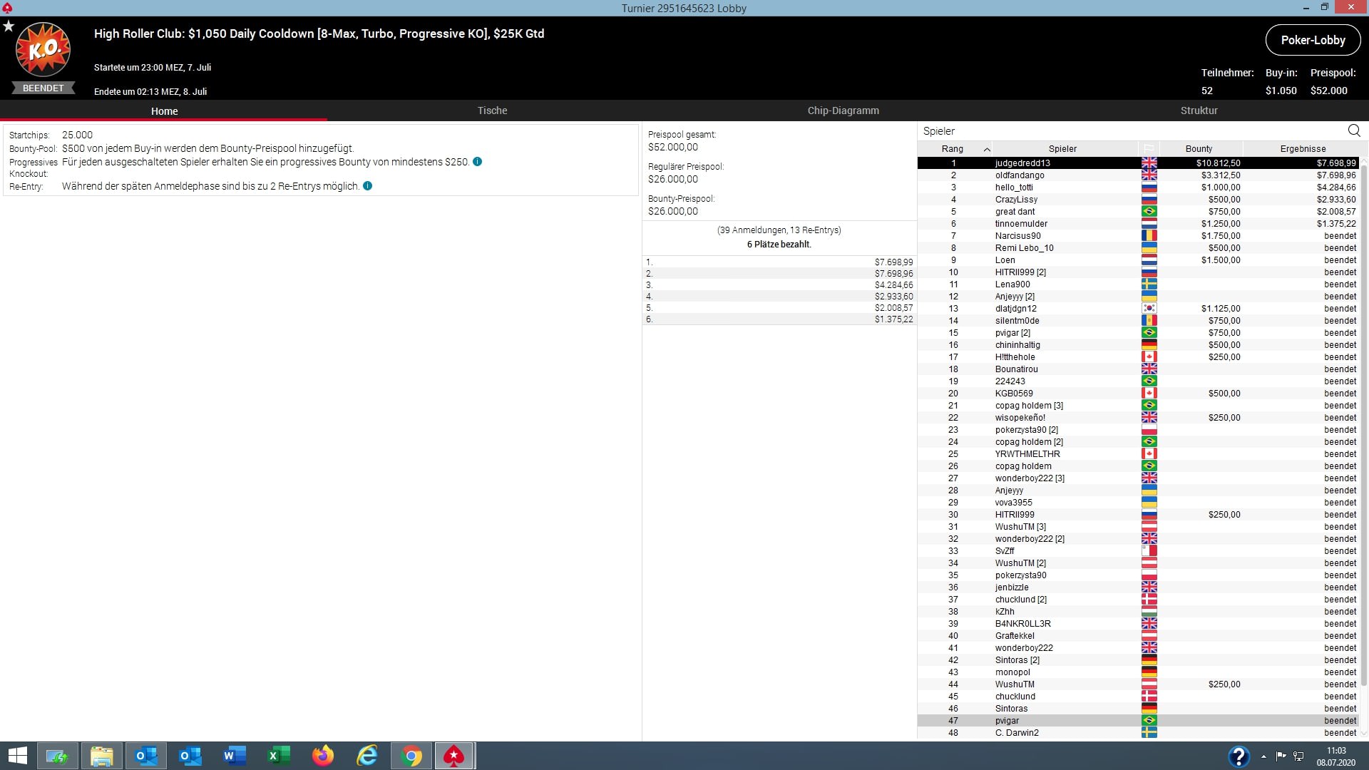 Außerdem gab es noch Siege für „judgedredd13“ (GBR – $7.698 + $10.812 Bounties) beim $1.050 Daily Cooldown und „poker.chekky“ (PLO – $4.367 + $6.640 Bounties) beim $530 Bounty Builder High Roller Late-Edition.