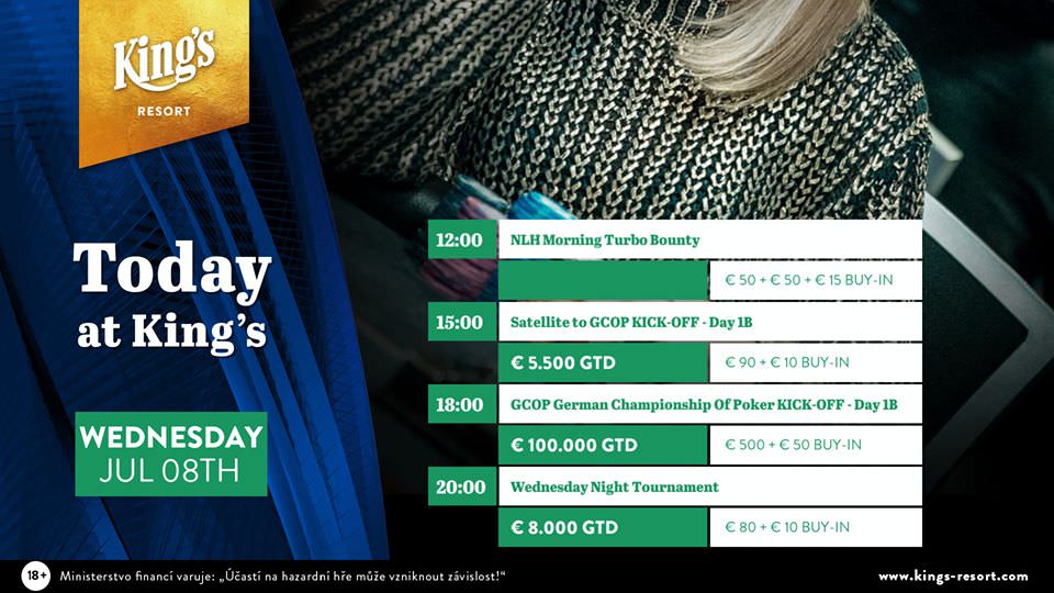 Zum Abschluss des Tages gibt es um 20:00 Uhr noch das €80+€10 King’s Wednesday Night Tournament, bei dem €8.000 garantiert werden. Hier beträgt die Startdotation 20.000 und jeder Level dauert 20 Minuten. Zwei Re-Entries sind erlaubt und die Late-Registration ist bis zum Start von Level 9 geöffnet.