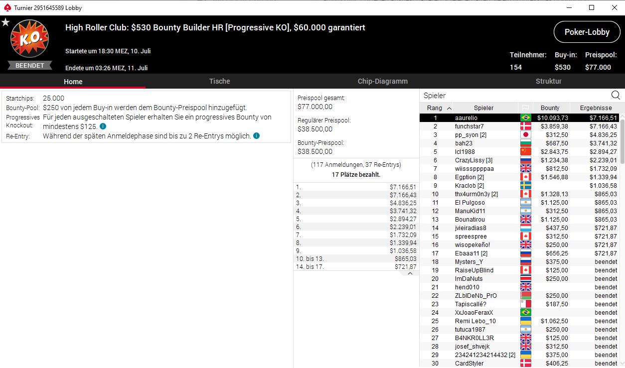Und mit dem $530 Bounty Builder HR beginnen wir auch diesen kurzen und knappen Artikel. Bei 154 Entries (117 plus 37) wurden insgesamt $77.000 ausgespielt, wie gewohnt je zur Hälfte in Form von Preisgeldern und Buounties.