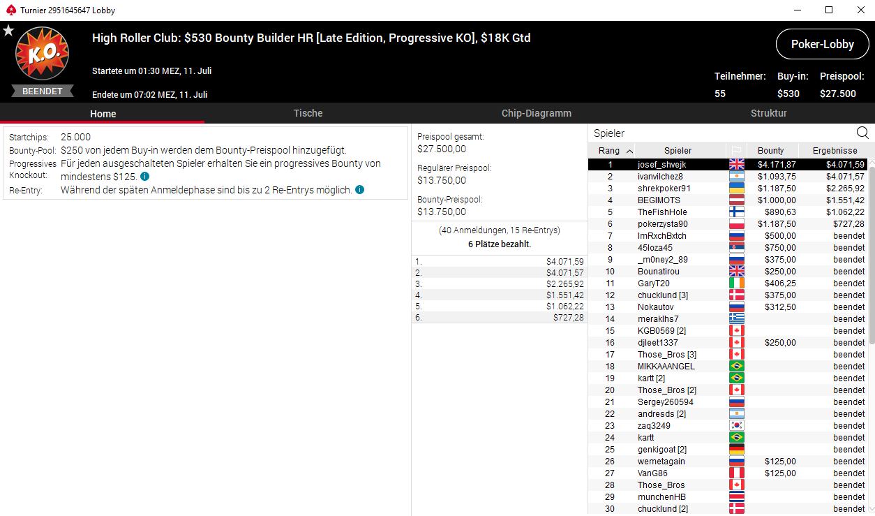 Im High Roller Club von PokerStars standen am Freitag vier Turniere auf dem Programmplan, die Beteiligung war insgesamt übersichtlich, mit Ausnahme des beliebten Bounty Builder HR.
