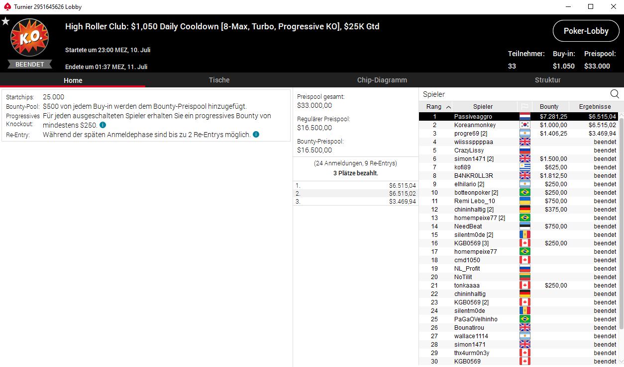 Das $1.050 Daily Cooldwon gewann der Niederländer Passiveaggro ($6.514,04/$7.281,25), das $530 Bounty Builder HR Late der Brite josef_shvejk ($4.071,59/$4.171,87).