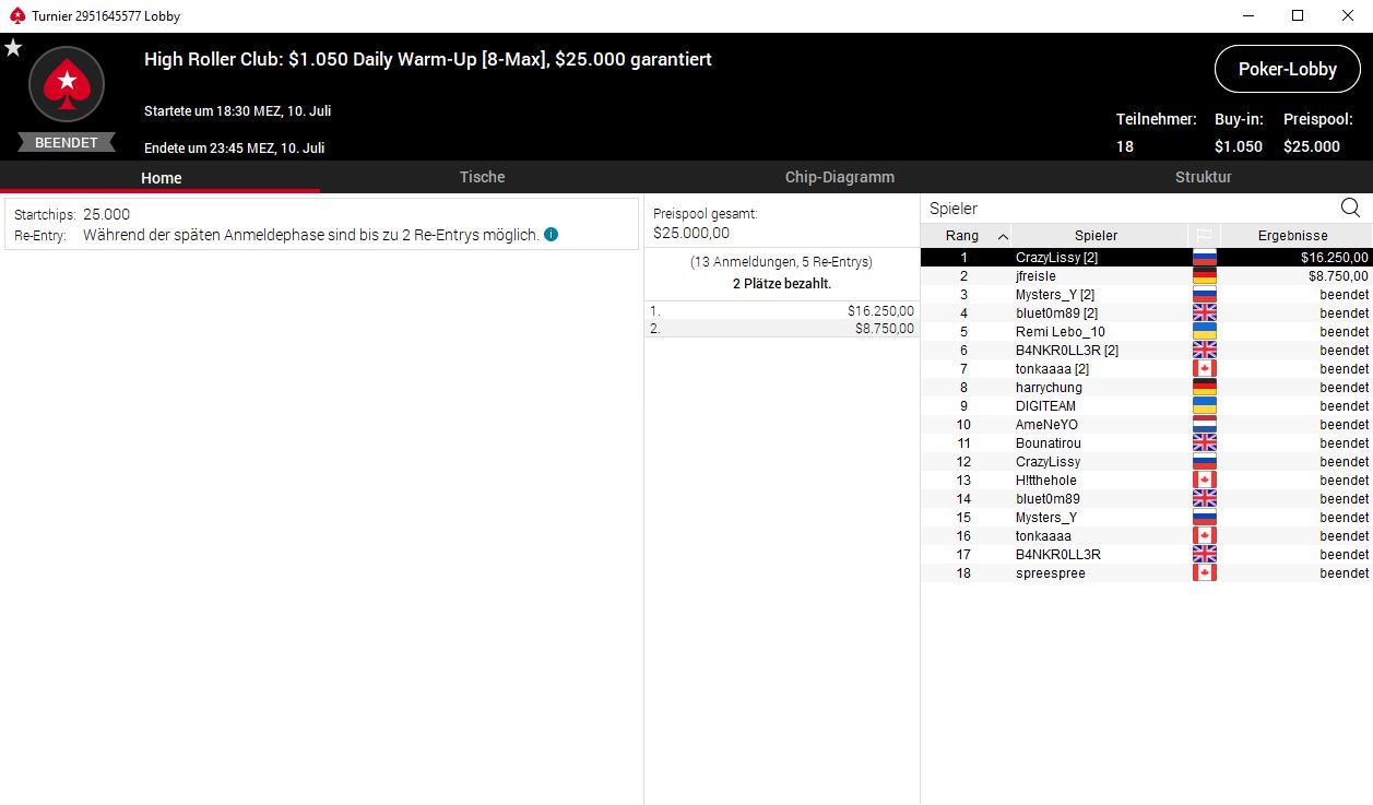 Die restlichen Turnier erinnerten eher an Sit & Gos, insbesondere das $1.050 Daily Warm-up mit 18 Entries (13 plus 5). Den $25.000-Preispool teilten sich der Russe CrazyLissy ($16.250) und Runner-up jfreisle ($8.750) aus Deutschland.