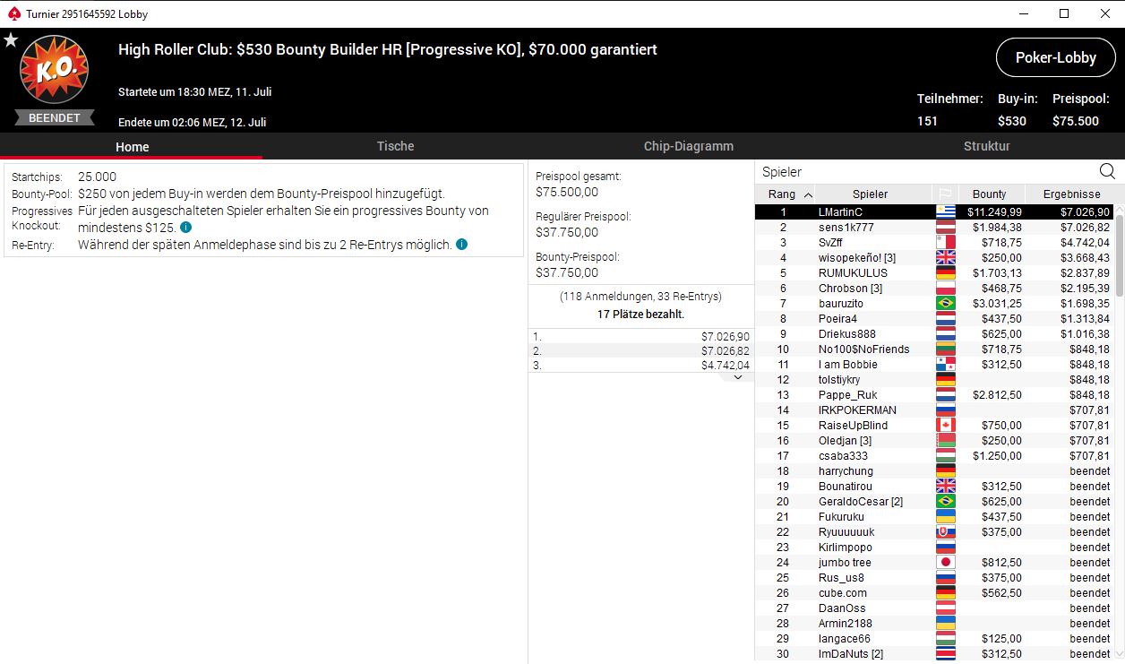 Beim Bounty Builder HR gab es insgesamt 151 Entries (118 plus 33) und somit einen Preispool in Höhe von $75.500. Die 17 bezahlten Plätze erreichten aus deutscher Sicht tolstiykry (($848,18) als Zwölfter und RUMUKULUS ($2.837,89/$1.703,13), der auf Platz fünf die Segel streichen musste. Dominik Bounatirou Nitsche und Landsmann harrychung schieden auf den Plätzen 19 und 18 aus.
