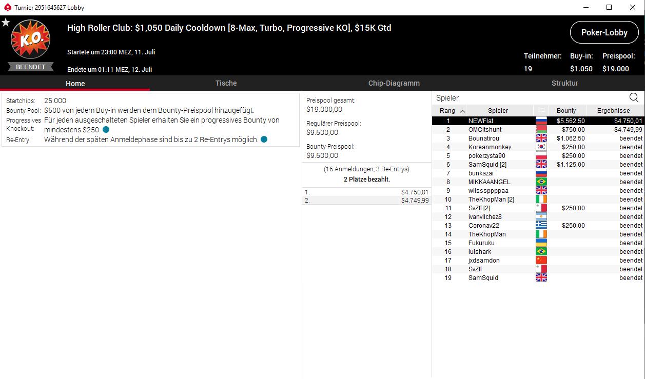 Für das Daily Cooldown meldeten gerade einmal 16 Spieler, dazu kamen drei Re-Entries, sodass $19.000 ausgespielt wurden. Bei nur zwei bezahlten Plätzen ging Dominik Bounatirou Nitsche als Dritter auch hier leer aus. Der Russe Denis NEWFlat Timofeev ($4.750,01/$5.562,50) besiegte Heads-up den Weißrussen Igor OMGitshunt Soyka ($4.749,99/$750).