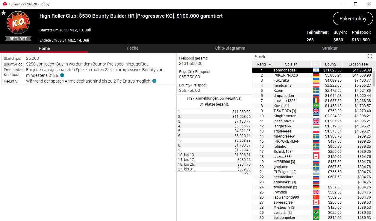Beim am Montag gestarteten $530 Bounty Builder HR setzte sich der Argentinier sonmonedas ($11.069,09/$11.025,36) vor P0KERPR02.0 ($11.068,90/$5.865,24) aus Deutschland durch. Rang vier belegte der Österreicher Stefan mindgamer Jedlicka ($5.355,27/$2.222,66).
