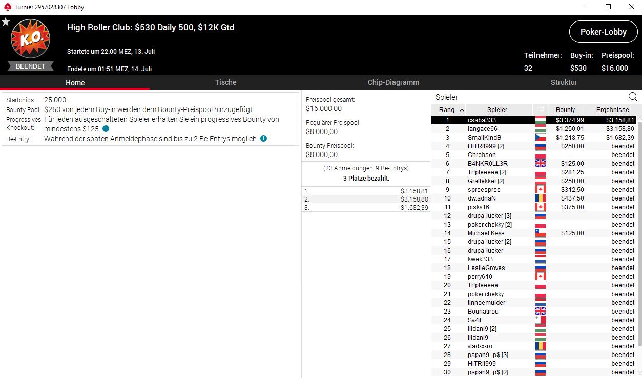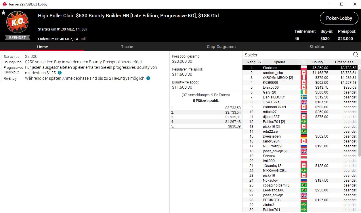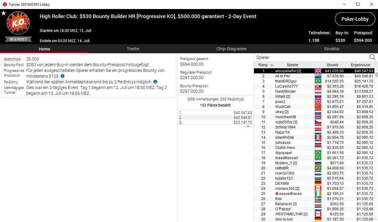 Beim am Sonntag gestarteten $530 Bounty Builder HR belegte der Schweizer Dinesh NastyMinder Alt einen guten fünften Platz für $13.508,27 Preisgeld, dazu kamen $4.984,39 an Bounties. Den Sieg holte der Brite wisopekeno! ($40.547,63/$41.035), der nach Tag eins noch nicht in der oberen Hälfte des Tableaus zu finden war.