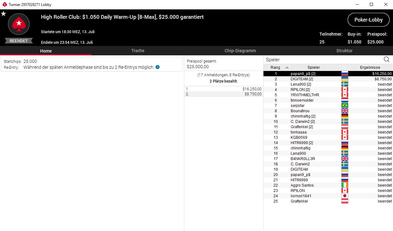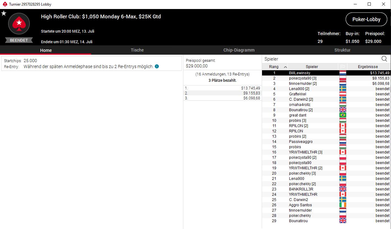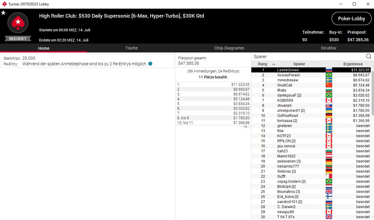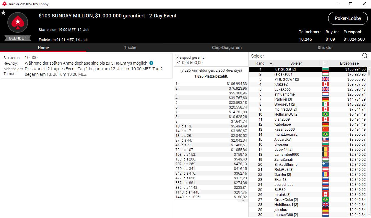 Den Sieg schnappte sich der Bulgare justcrucial, der ohne Deal durchkam und $106.994,33 abräumte. Die Plätze zwei und drei belegten der Ungar lajoska001 ($76.923,96) und der Brite Tom 7tHEcROw7 MacDonald ($55.308,96).
