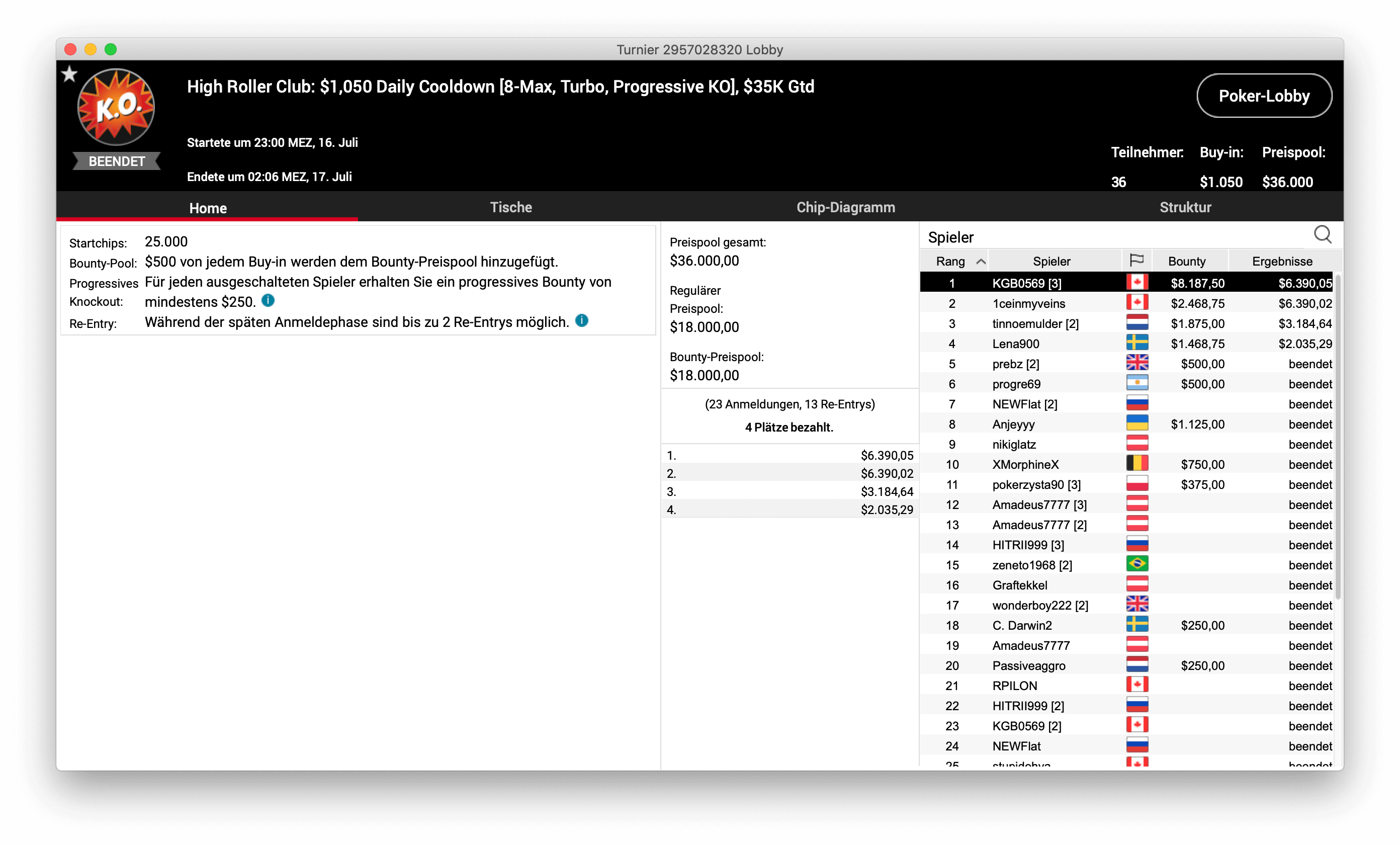 Sowohl im Daily Cooldown für $1.050 als auch im $1.050 Thursday Thrill konnte „KGB0569“ sein Spiel unter Beweis stellen und Flips gewinnen. Beim Daily Cooldown gab es 36 Entries von 23 Spielern, woraus ein $36.000-Preispool entstand. „KGB0569“ gewann in dem PKO-Turnier für insgesamt über $14,5k mit seiner Platzierung und Bounties vor seinem Landsmann „1ceinmyveins“, der als Zweiter knapp $8,8k einsackte.