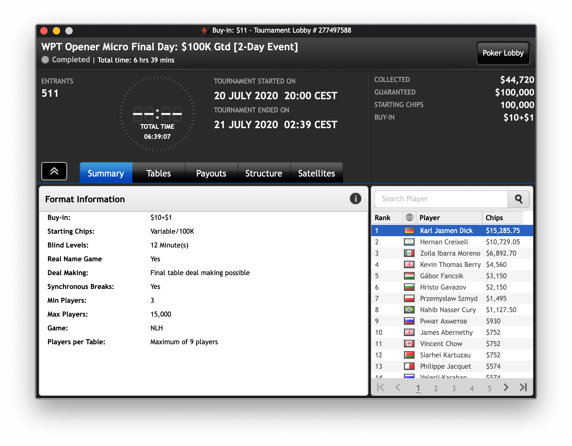 Dick gewann das Opener Micro, bei dem die 511 Entries für $10+1 dabei waren. Das Turnier hatte ein massives Overlay, jedes Buy-In gab es verdoppelt als Value oben drauf. $100.000 waren im Preispool bei $44.720 summierten Buy-Ins. Dick schnappte sich den Sieg für $15.285,75.
