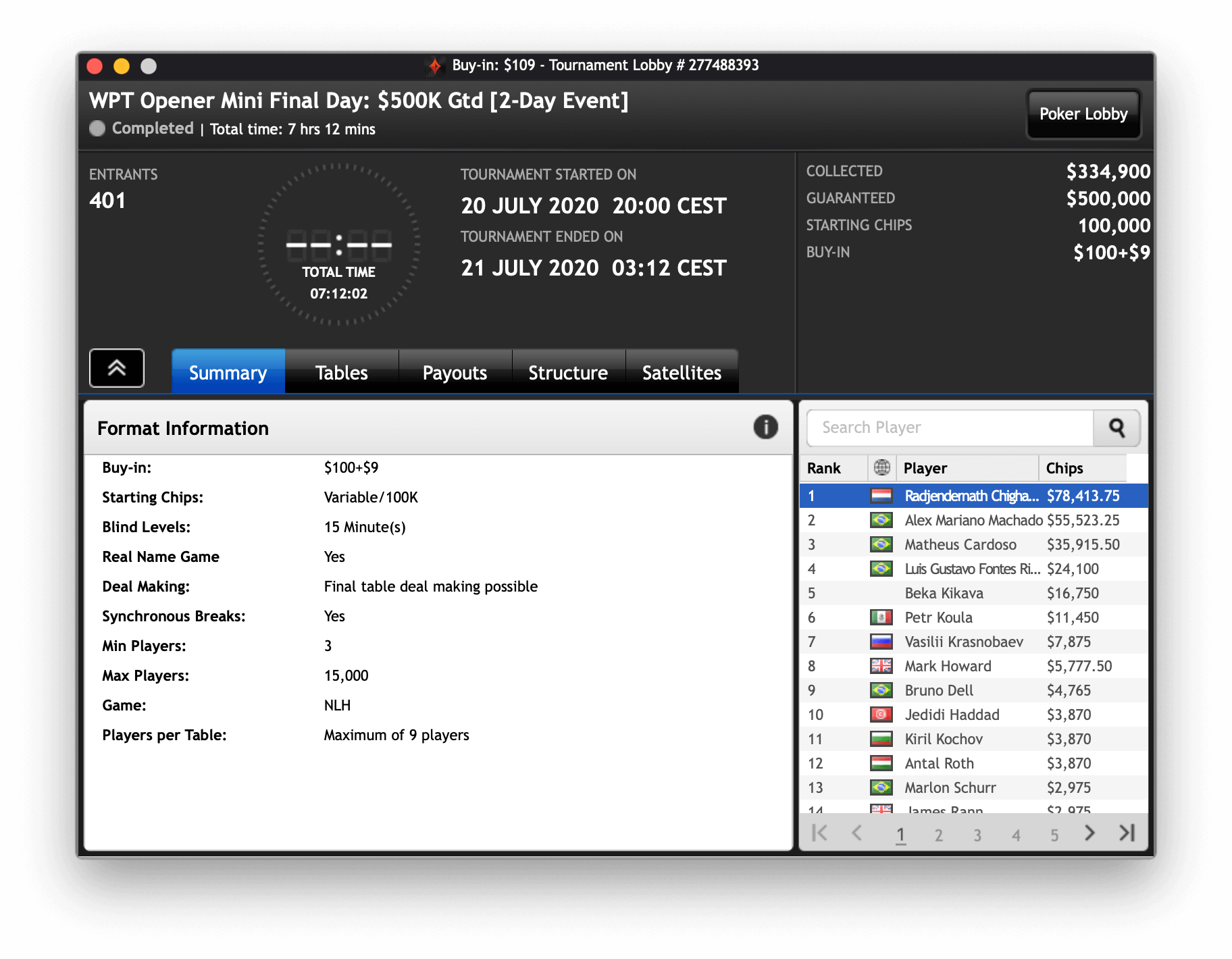 Beim Opener Mini gab es ebenfalls ein Overlay, 401 Entries zahlten die $109, es gab $500.000 im Preispool. Den Großteil holte sich der niederländische Sieger Radjernath Chigharoe mit $78.413,75.
