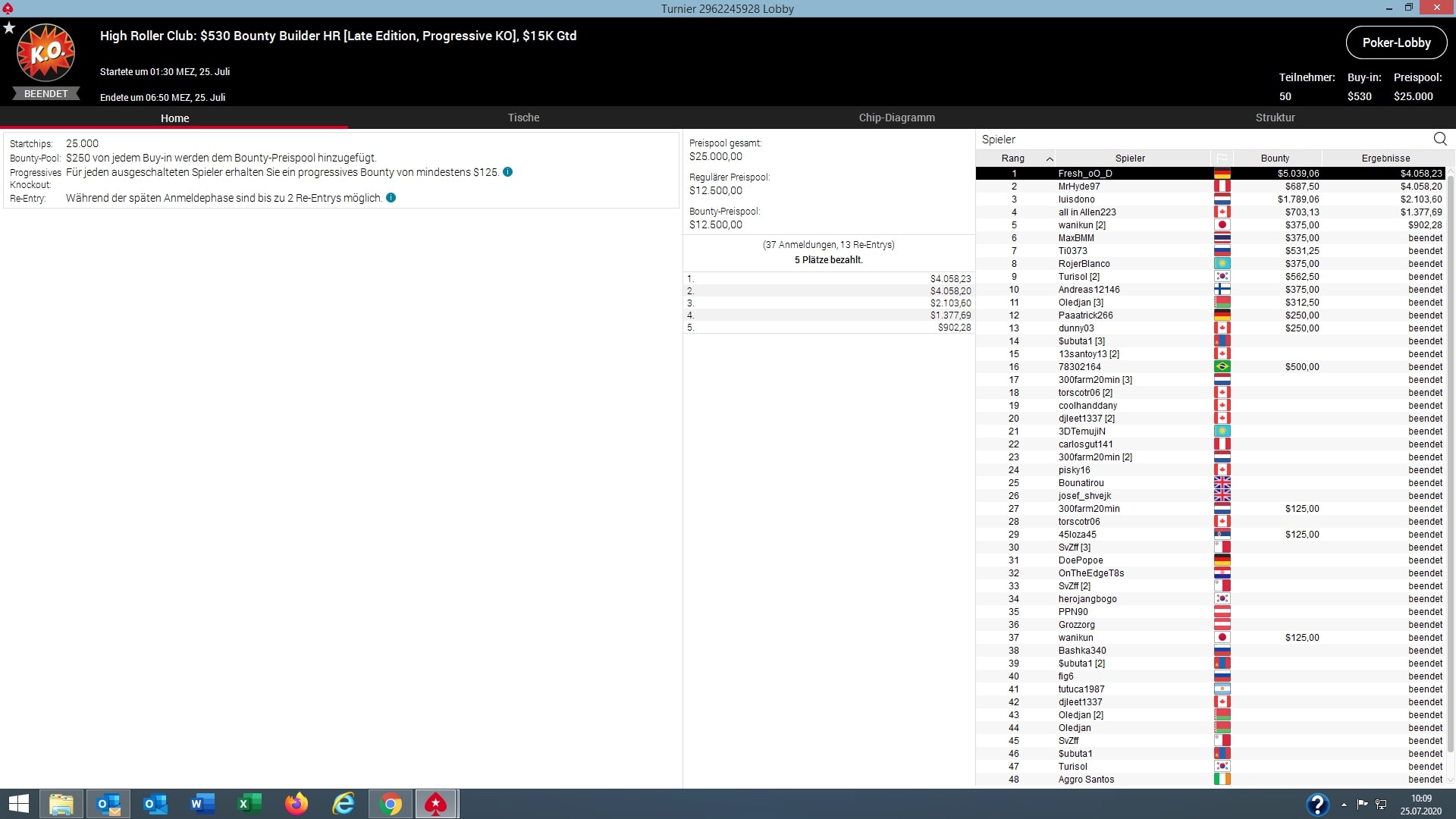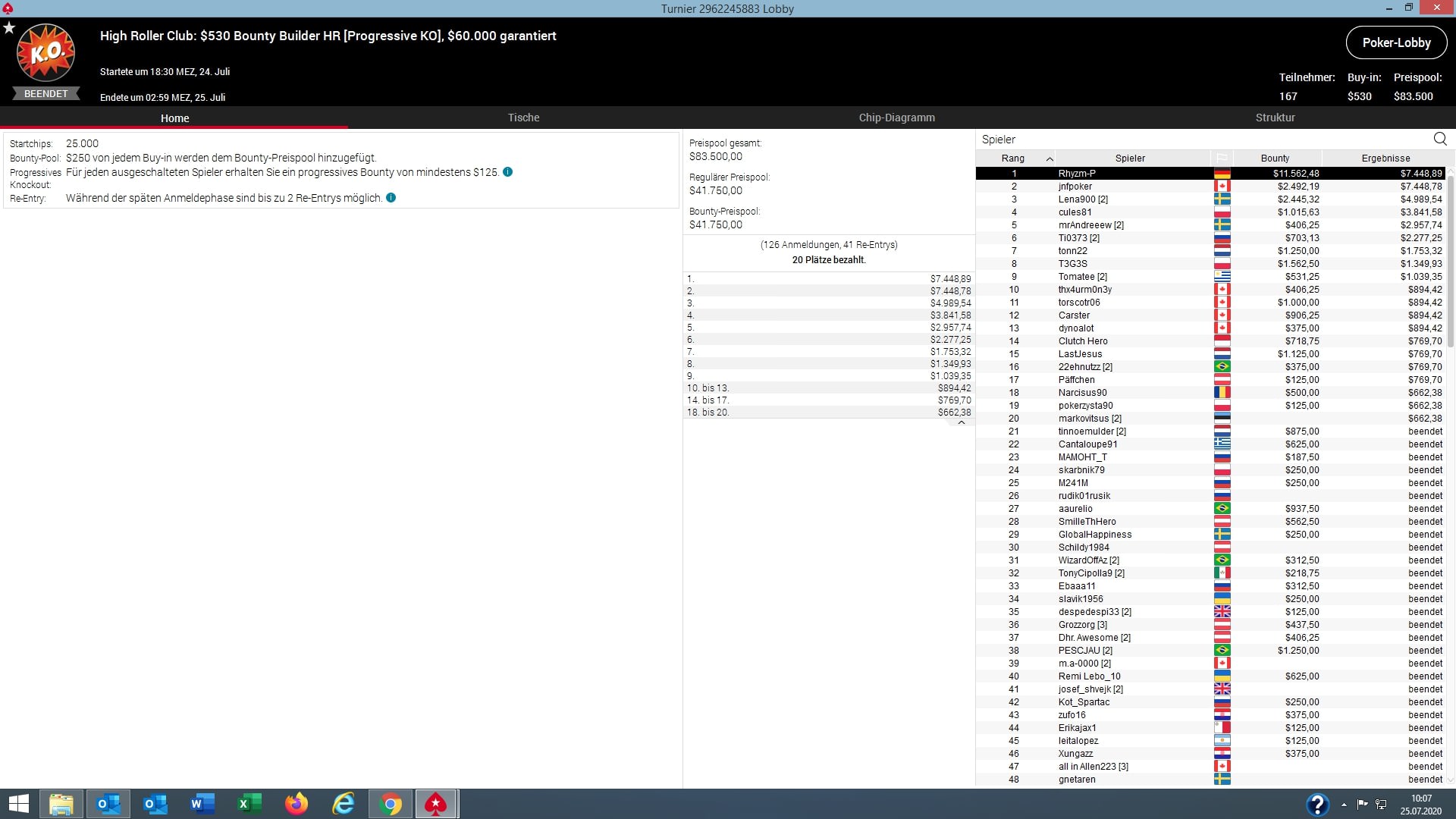 Das $530 Bounty Builder High Roller lockte 167 Online-Grinder an und so ging es hier um ein Preisgeld von $83.500. Im Heads-Up konnte sich der Deutsche „Rhyzm-P“ gegen den Kanadier „jnfpoker“ durchsetzen und das Turnier für ein Preisgeld von $7.448 + $11.562 gewinnen.