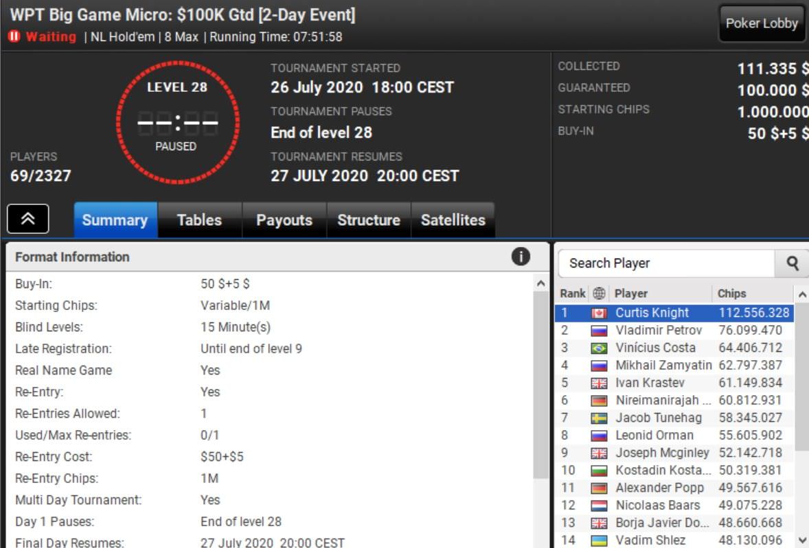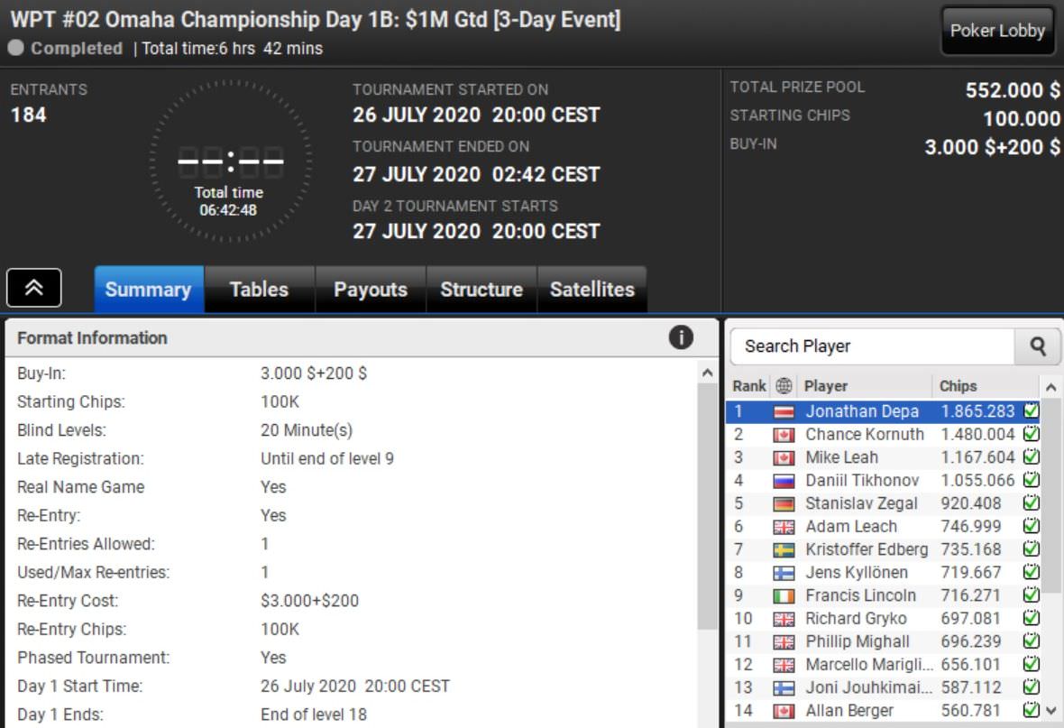 184 Spieler bezahlten das Buy-In von $3.200, davon erreichten 30 den nächsten Turniertag. Auch einige DACH-Spieler wie Andreas Freund, Christopher Frank, Jan Collado, Oliver Weis und Stanislav Zegal sind eine Runde weiter.
