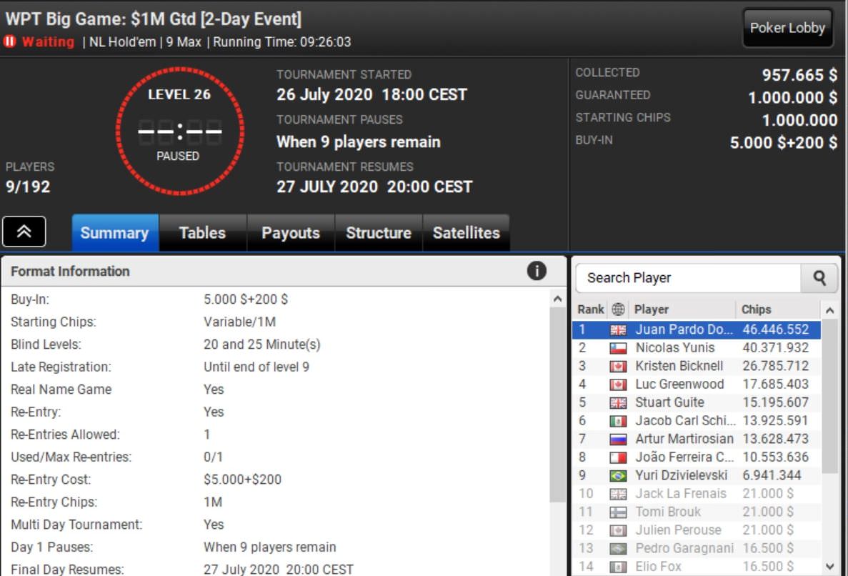 Beim $5.200-Turnier wurde die Garantie von $1Million knapp verpasst, und leider wird kein DACH-Spieler im Finale dabei sein.