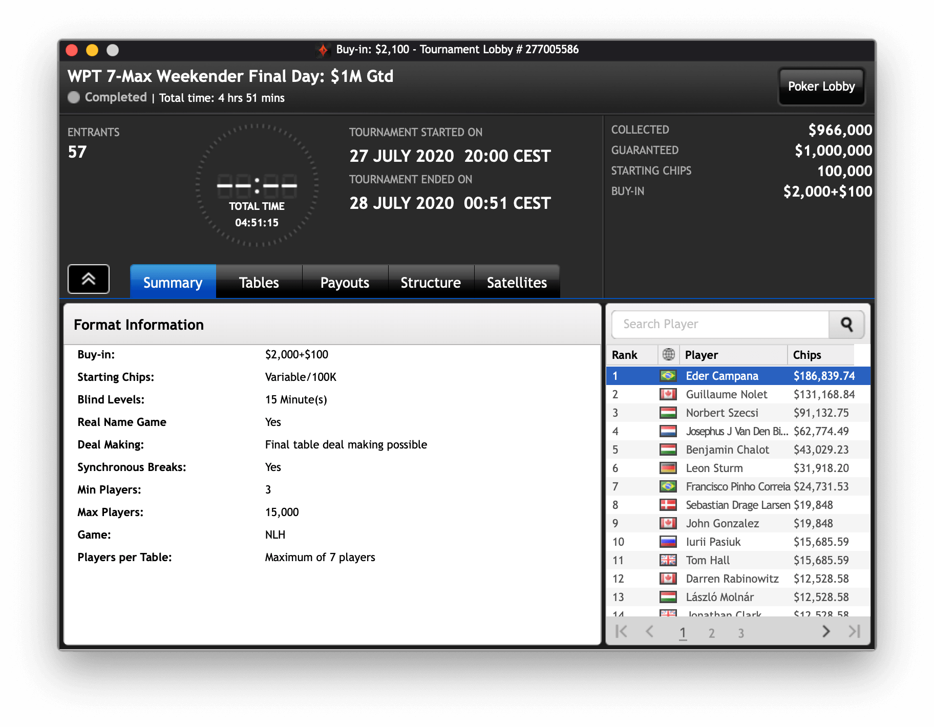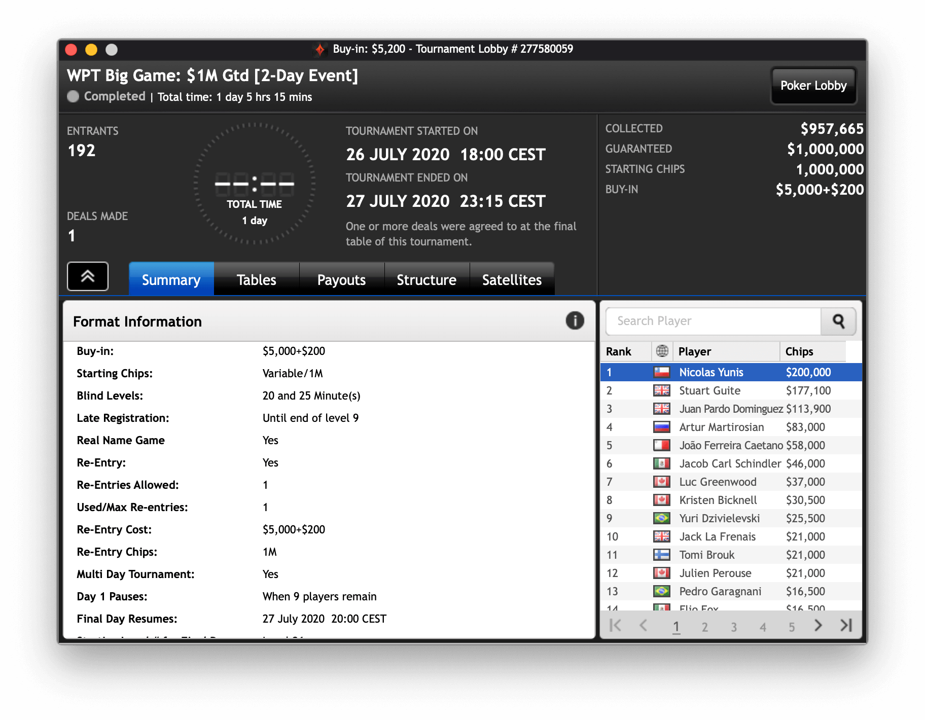 Auch über einen satten Score darf sich der Chilene Nicolas Yunis freuen. Er gewann das Big Game, bei dem es ebenfalls um $1 Mio Dollar GTD ging, mit einem Buy-In von $5.200. Für den Sieg gab es glatte $200.000.