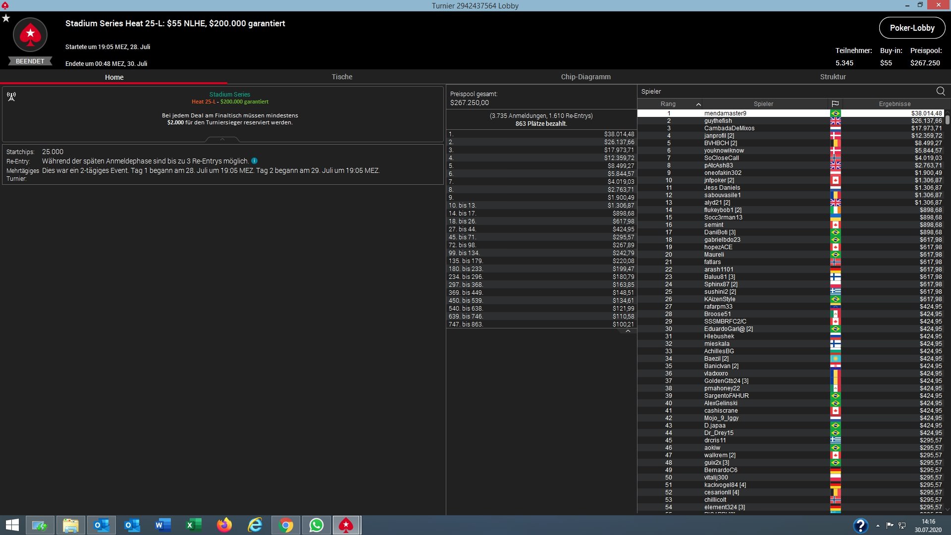 Dann gab es noch das Finale des $55 NLHE Events #25-L. Hier triumphierte „mendamaster9“ und cashte $38.014. Bester DACH-Spieler wurde „oneofakin302“ auf Platz 9 für $1.900.