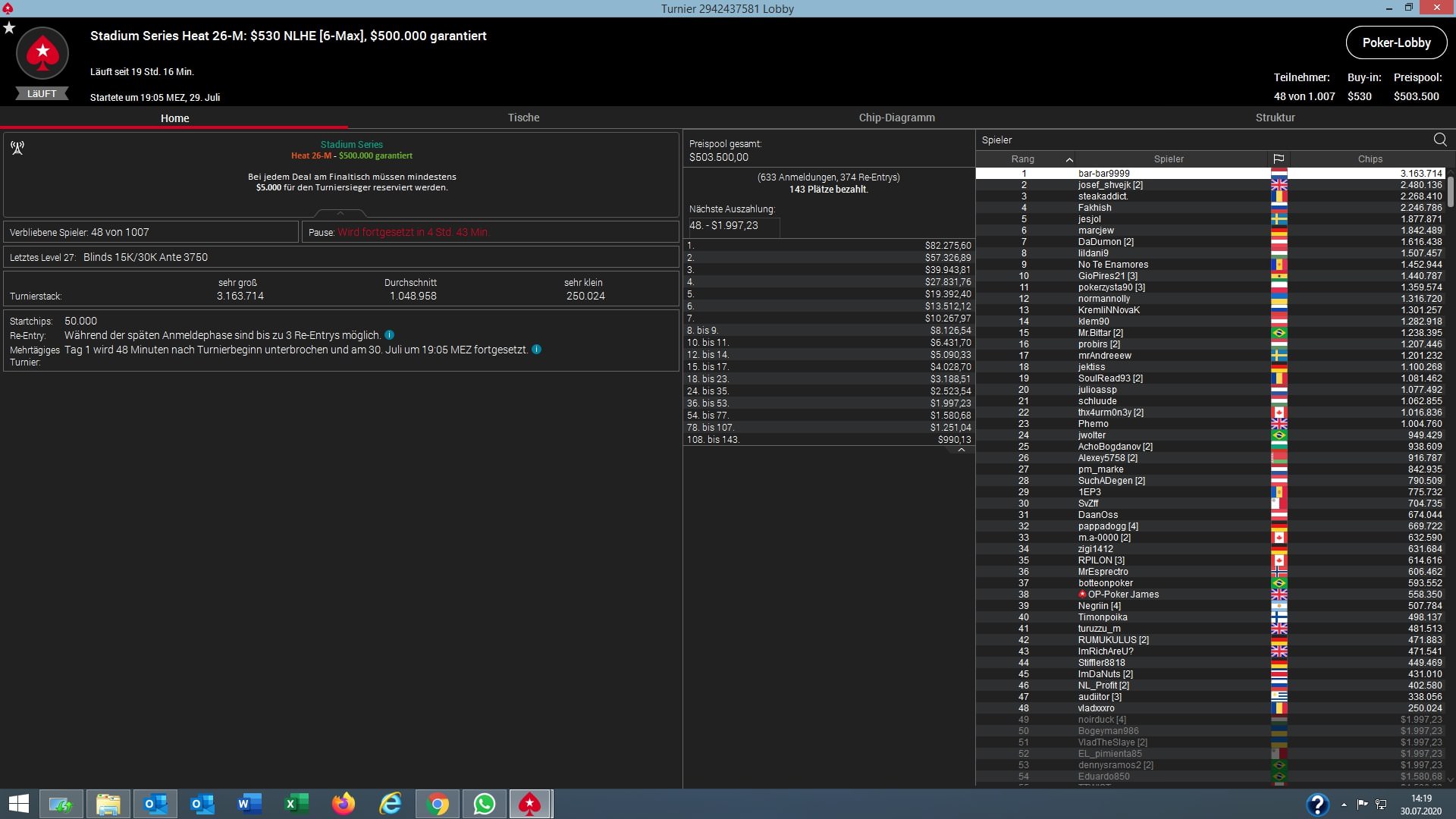 | 2020-07-30 19:05:00 | Stadium Series Heat 27-M: $530 NLHE [8-Max,][Progressive][KO], $1M Gtd | 1.000.000 $* |