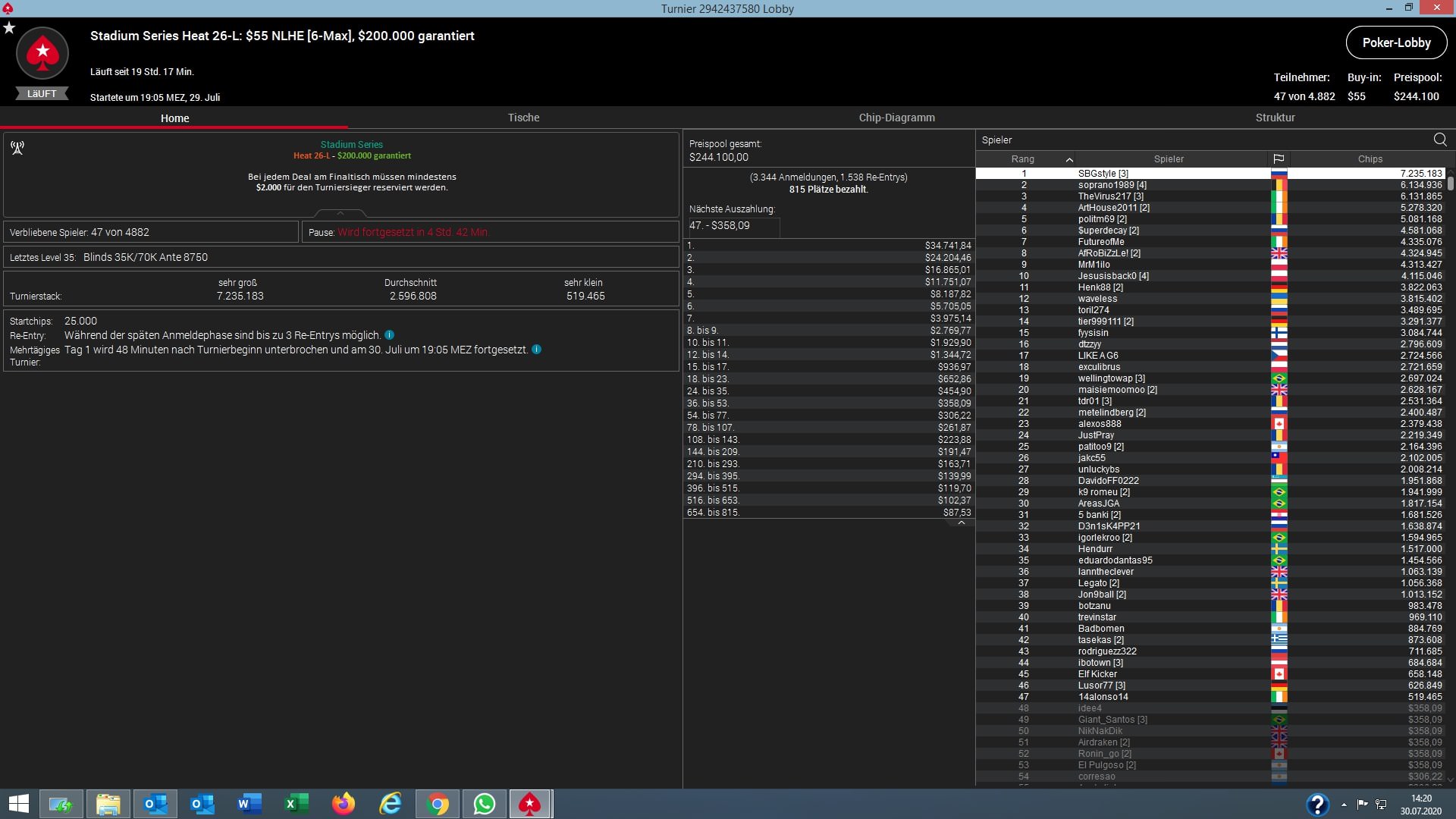 | 2020-08-01 19:05:00 | Stadium Series Heat 29-L: $55 NLHE [Progressive][KO], $250K Gtd | 250.000 $* |