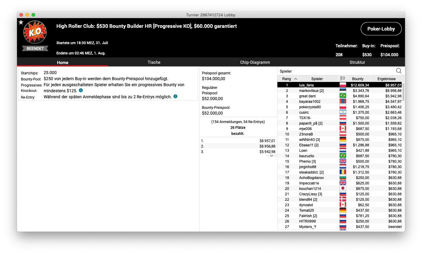Im High Roller Club auf PokerStars ging es gestern eher gemächlich zu. Nur drei Turniere standen auf der Agenda und in Zwei davon konnte die Garantie nicht geknackt werden.