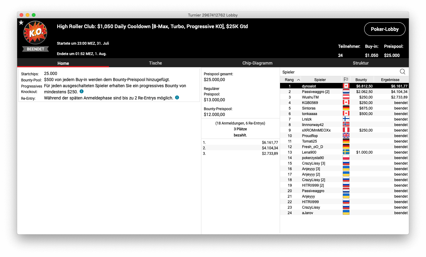 Beim Daily Cooldown mit $1.050 Buy-In war es Alex „dynalot“ Difelice, der sich durchsetzte. Er gewann das Turnier für knapp $13k vor dem Niederländer „Passiveaggro“. Auf Platz 3 spielte sich Thomas Mühlöcker mit dem Nick „WushuTM“ für knapp $3k.