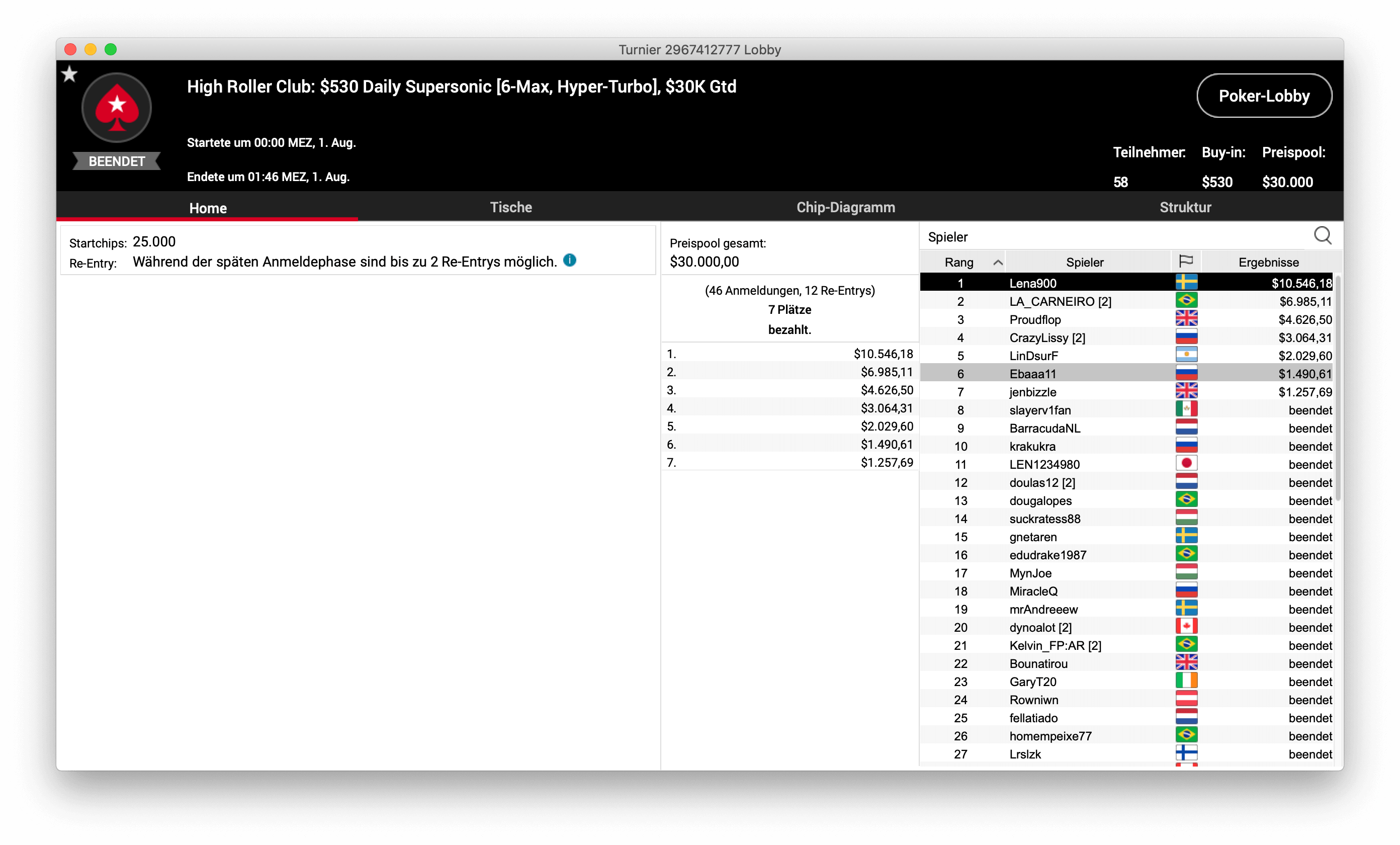 „Lena900“ alias Niklas Astedt profitierte vom Overlay beim $530 Daily Supersonic, wo er sich gegen 45 weitere Spieler, die mit ihm insgesamt 58 Entries nutzten, durchsetze. Astedt gewann das Turnier für $10.546.