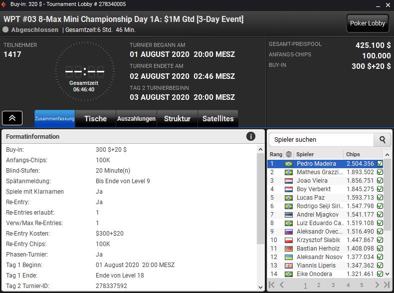 Bei den World Poker Tour (WPT) Online Championships auf partypoker gab es am Samstag keine Entscheidungen, dafür wurden die Starttage 1A der WPT 8-Max Championship und die Starttage 1B beim WPT 8-Max Warm-Up gespielt.
