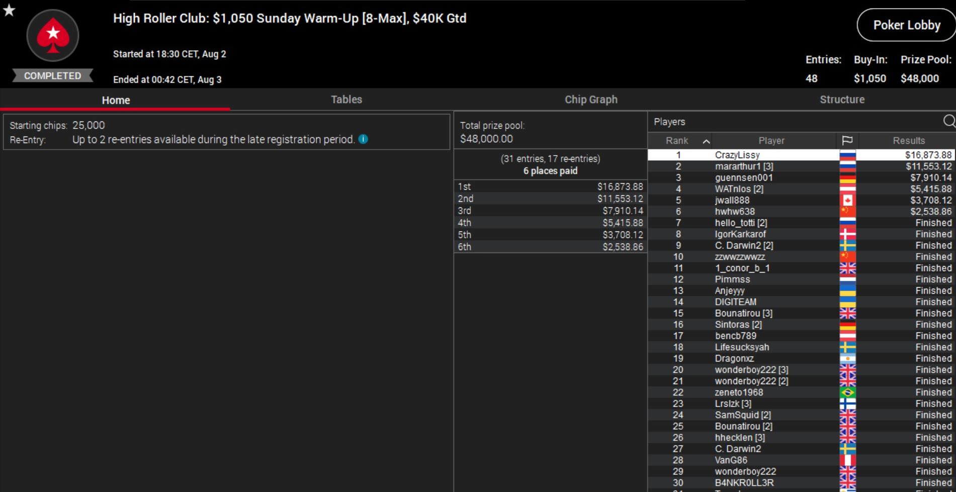 Erfolgreichster Spieler aus deutschsprachiger Sicht war dabei Christian „WATnlos“ Rudolph, der mit einem 4. Platz beim $1.050 Warm-Up in den Tag startete und diesen mit einem 3. Platz beim $1.050 Cooldown beendete.