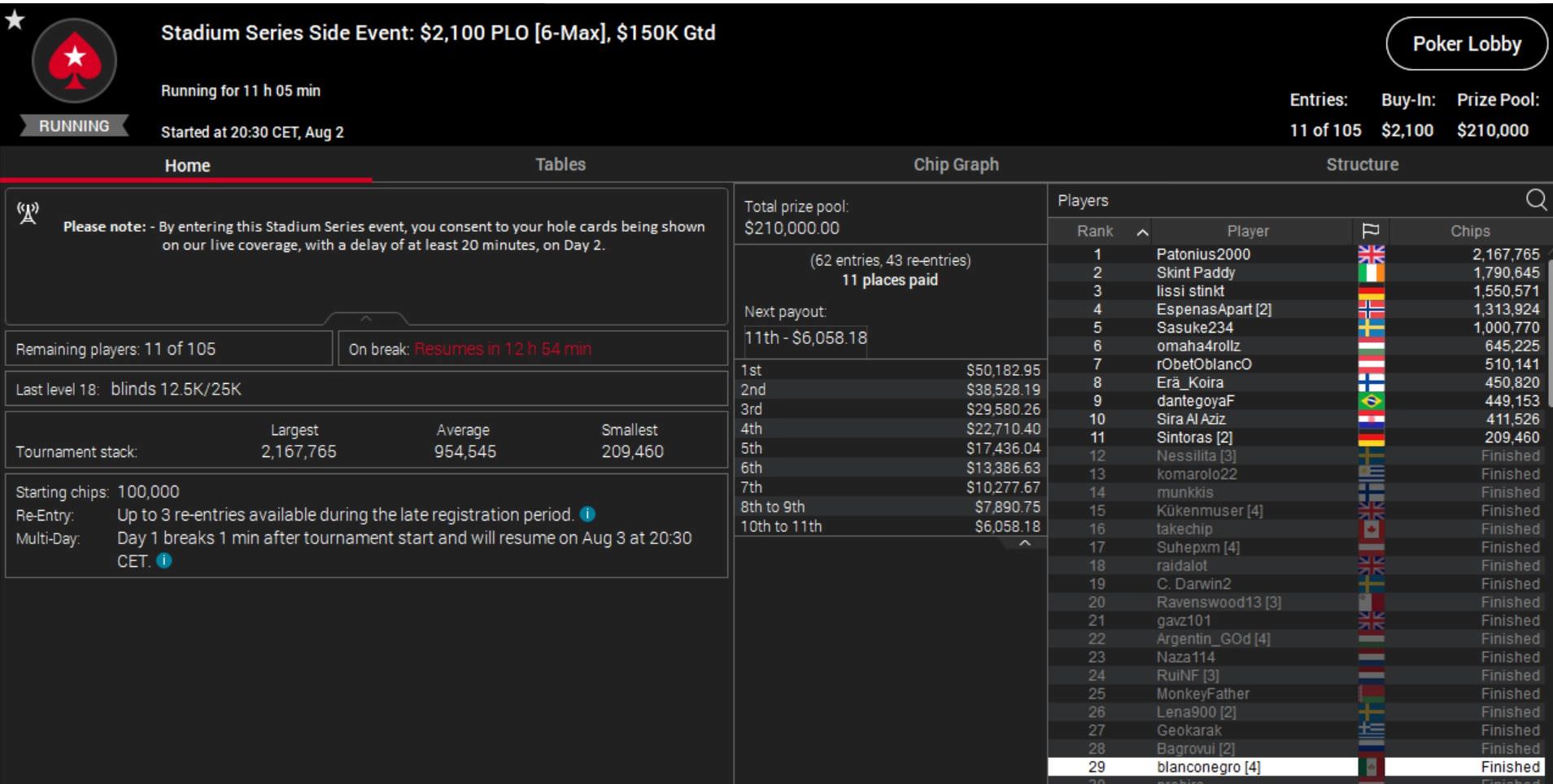 Pech hatte Christoph Vogelsang als bester Deutscher in der $10.300 teuren High-Variante, denn er schied als Bubble Boy aus. In Führung liegt hier Niklas „Lena900“ Astedt.