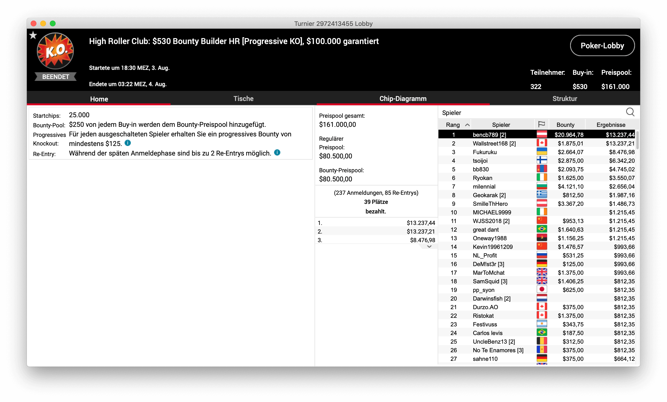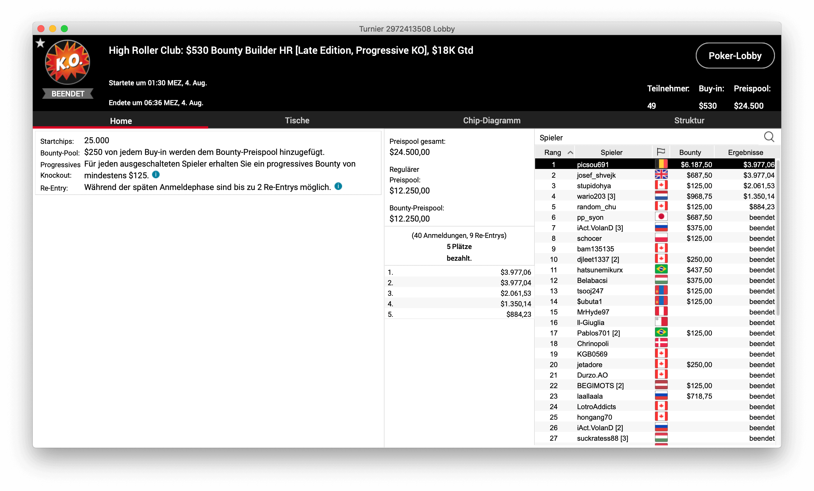 Der konnte das $530 Bounty Builder HR gewinnen. Rolle gewann $13.237 und machte mit Bounties $20.964. 237 Spieler nahmen an dem Turnier mit 322 Entries teil und sorgten so für einen $161.000-Preispool.