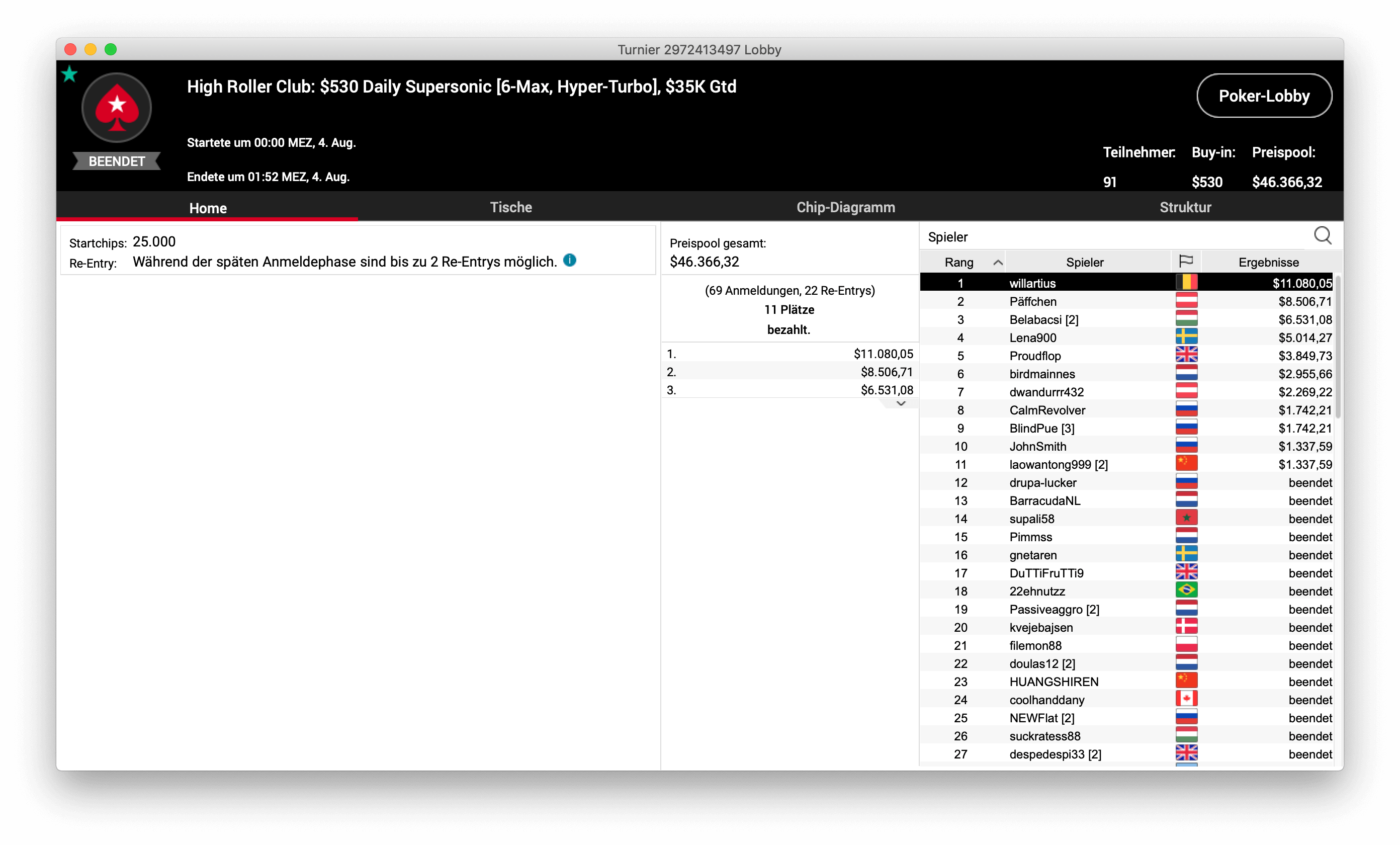 Pascal Hartmann, auf PokerStars als „Päffchen“ unterwegs, verpasste den Sieg nur knapp. Beim $530 Daily Supersonic, einem 6-Max Hyper Turbo, reichte es für ihn nur für Platz 2 und $8.506 Cash. Den Sieg holte der Belgier „willartius“ für $11.080. Auf Platz 4 spielte sich Niklas „Lena900“ Astedt für $5.014.
