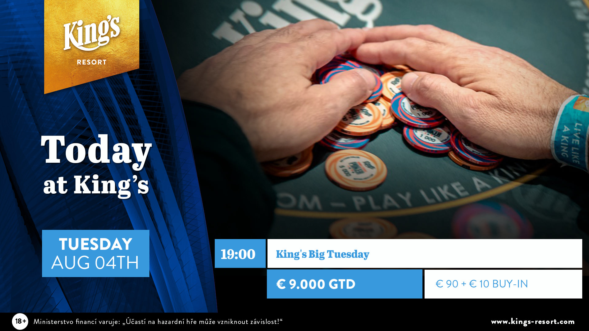 Heute steht im King’s Resort das Big Tuesday auf dem Programm. Bei dem Turnier gibt es für ein €90+10 Buy-In eine Garantie von €9.000. Ansonsten wie immer rund um die Uhr laufend Cash Games ab €1/€3 NLH und €2/€2 PLO. Alle Informationen findet Ihr auf der Webseite des King’s Resort.