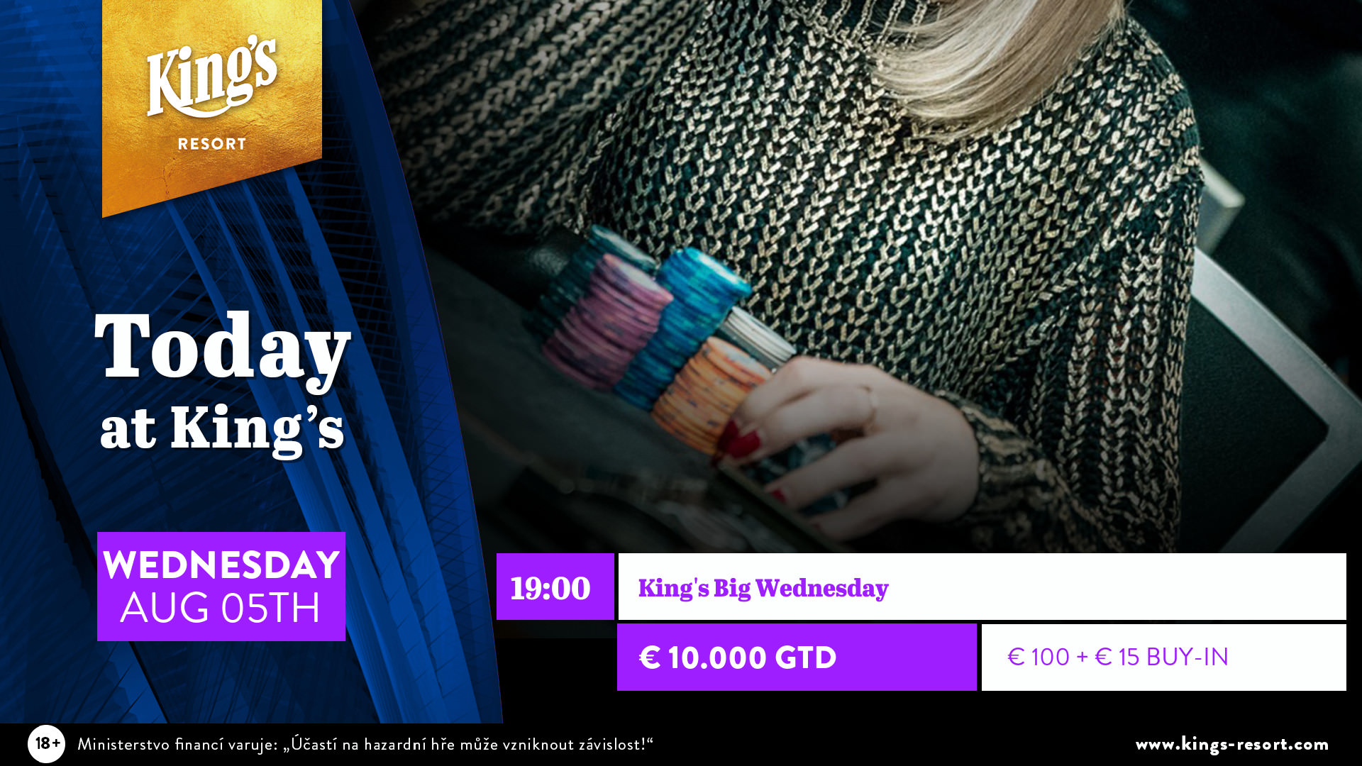 Am Mittwoch steht im King’s Resort das Big Wednesday an, bei dem für ein Buy-In von €100+15 eine Summe in Höhe von €10.000 vom King’s garantiert wird. Wie immer gibt es im King’s Resort rund um die Uhr Cash Games ab €2/€2 Pot Limit Omaha und €1/€3 Texas Hold’em. Alle Informationen gibt es auf der Webseite des King’s Resort.
