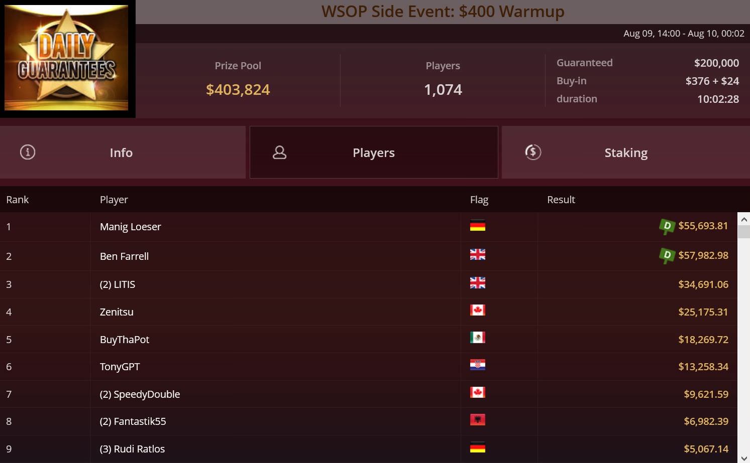 Manig Löser siegte nach Deal mit dem Briten Ben Farrell beim WSOP Side Event $400 Warm-up und kassierte gut $55.000.