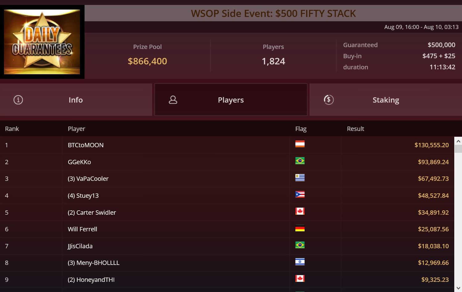 Sogar über $130.000 schnappte sich „BTCtoMOON“ aus Österreich beim WSOP Side Event $500 Fifty Stack. Er setzte sich gegen 1.823 Konkurrenten durch, darunter auch den Sechstplatzierten „Will Ferrell“ aus Deutschland.