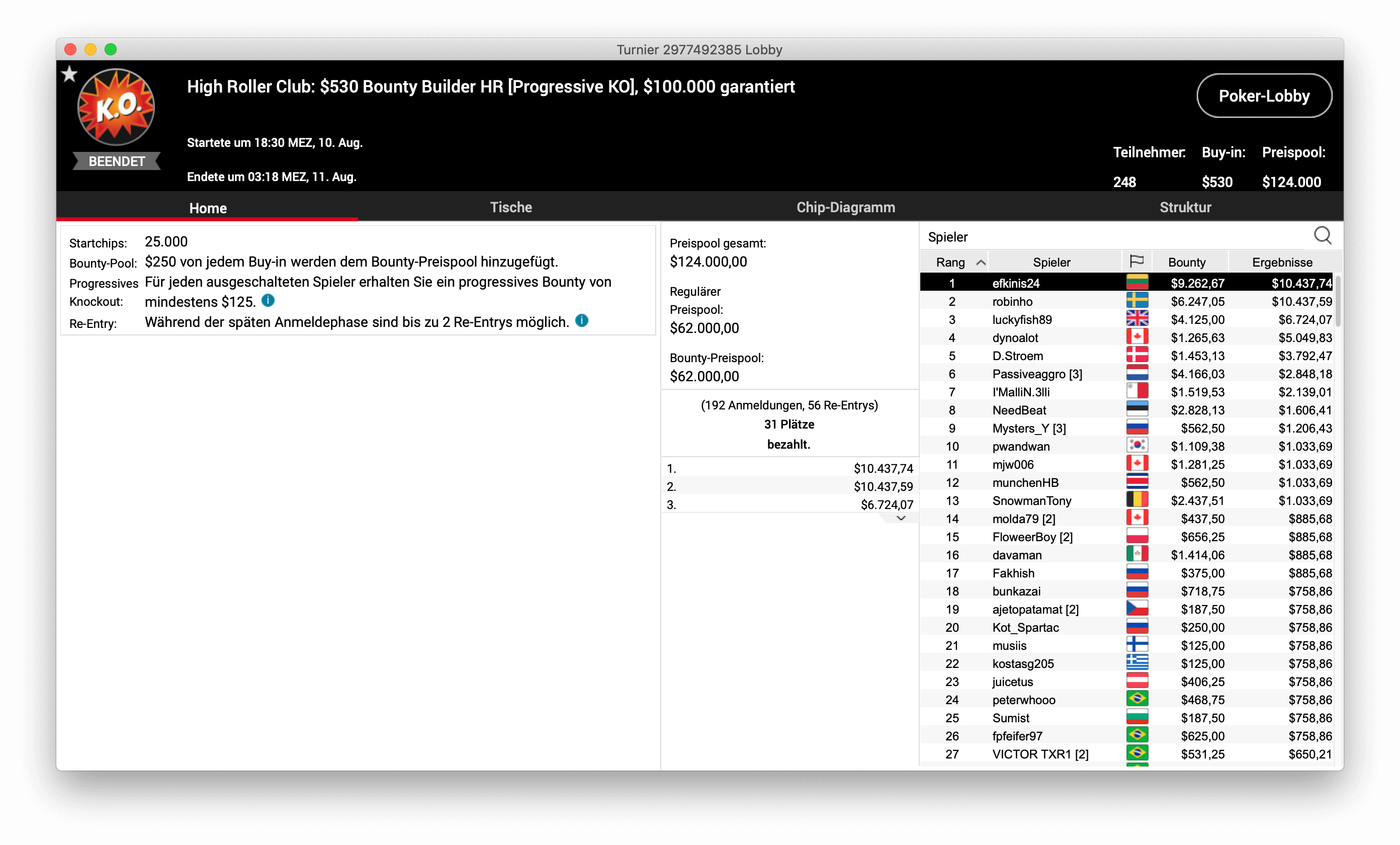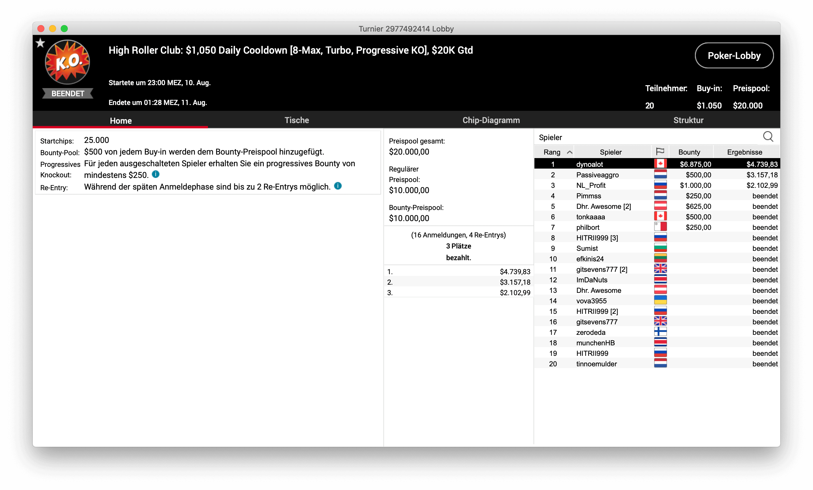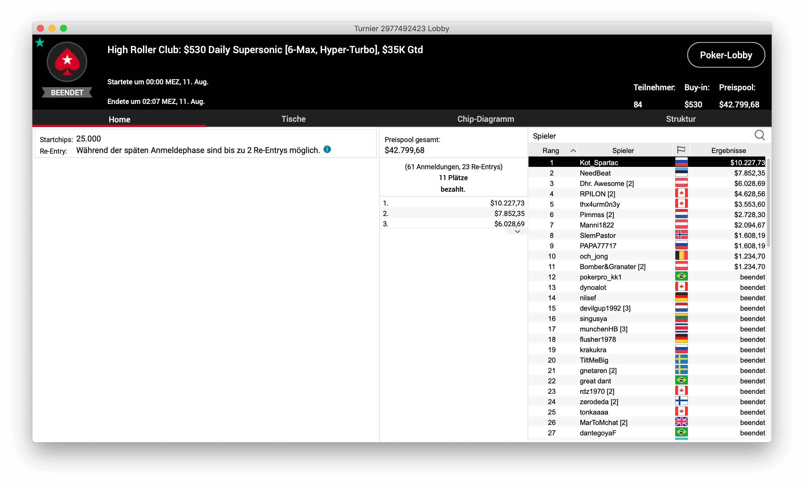 Weitere Ergebnisse des High Roller Club vom 10.08.2020: