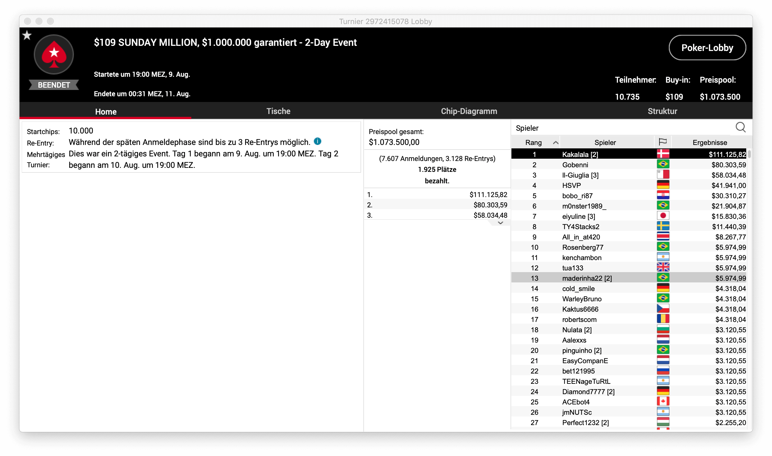 Bei der Sunday Million kamen 10.735 Entries von 7.607 Spielern zusammen, womit es um eien $1.073.500 Preispool ging. Den Sieg schnappte sich „Kakalala“, der im Heads-Up den Brasilianer Nicolas „Gobenni“ Coppini besiegte. „Kakalala“ bekommt für seinen Sieg $111.125 für Coppini gibt es $80.303.