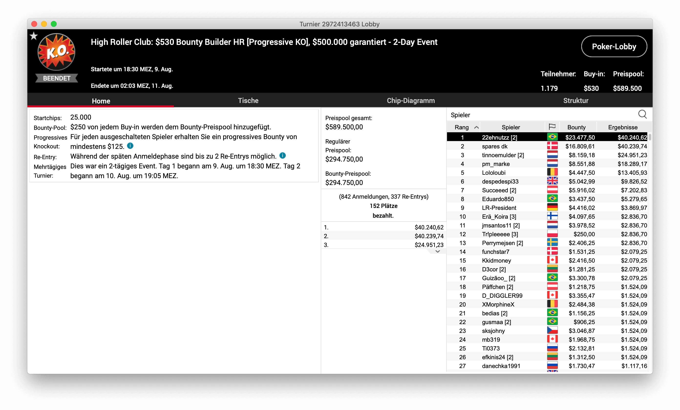 Beim großen $530 Bounty Builder HR, auf 2-Tage angelegt, mit 1.179 Entries gab es einen $589.500-Preispool. Den Löwenanteil gewann der Brasilianer Gustavo „22ehnutzz“ Mastelotto, der mit Bounties und für seine Platzierung über $64.000 gewinnen konnte.