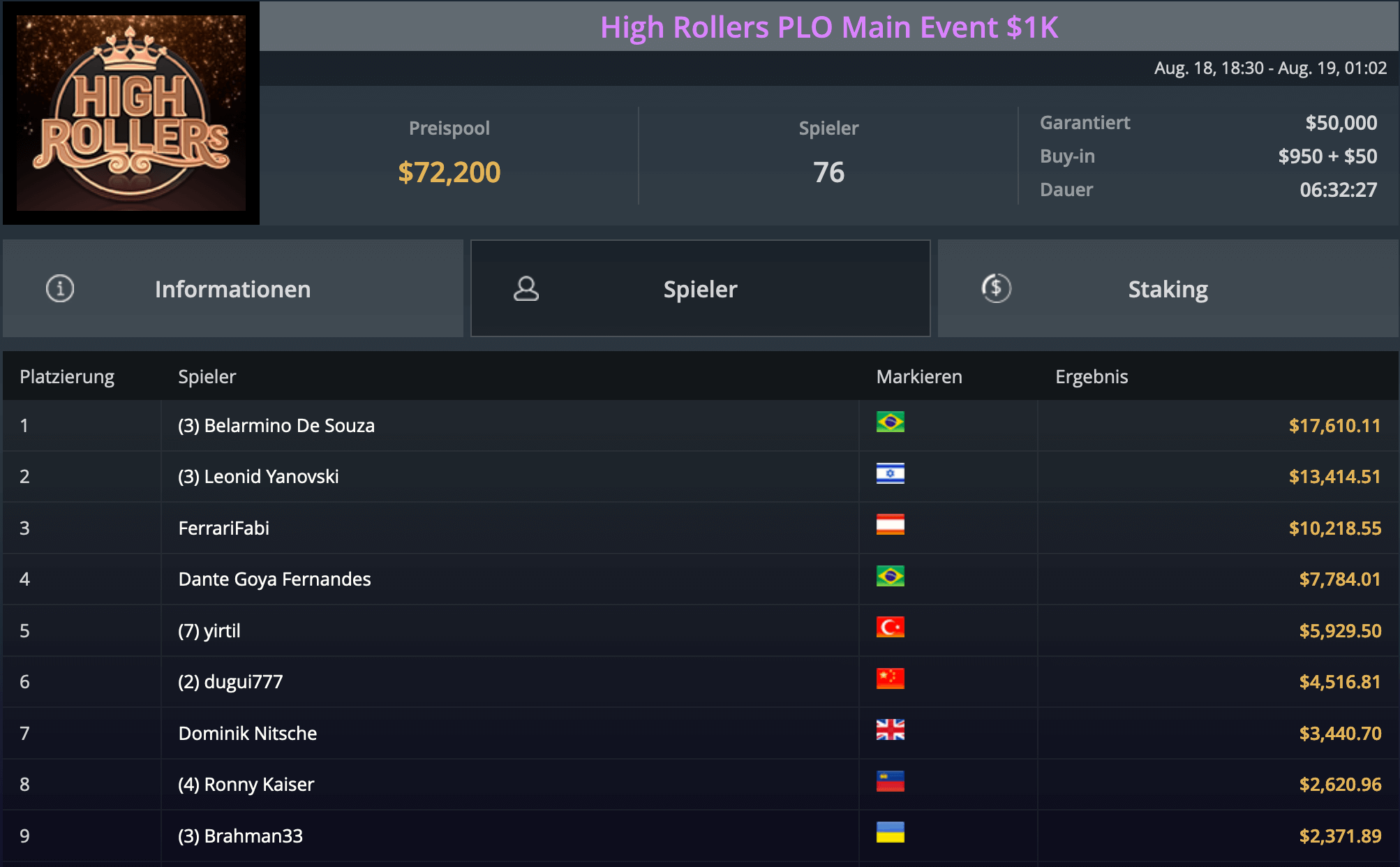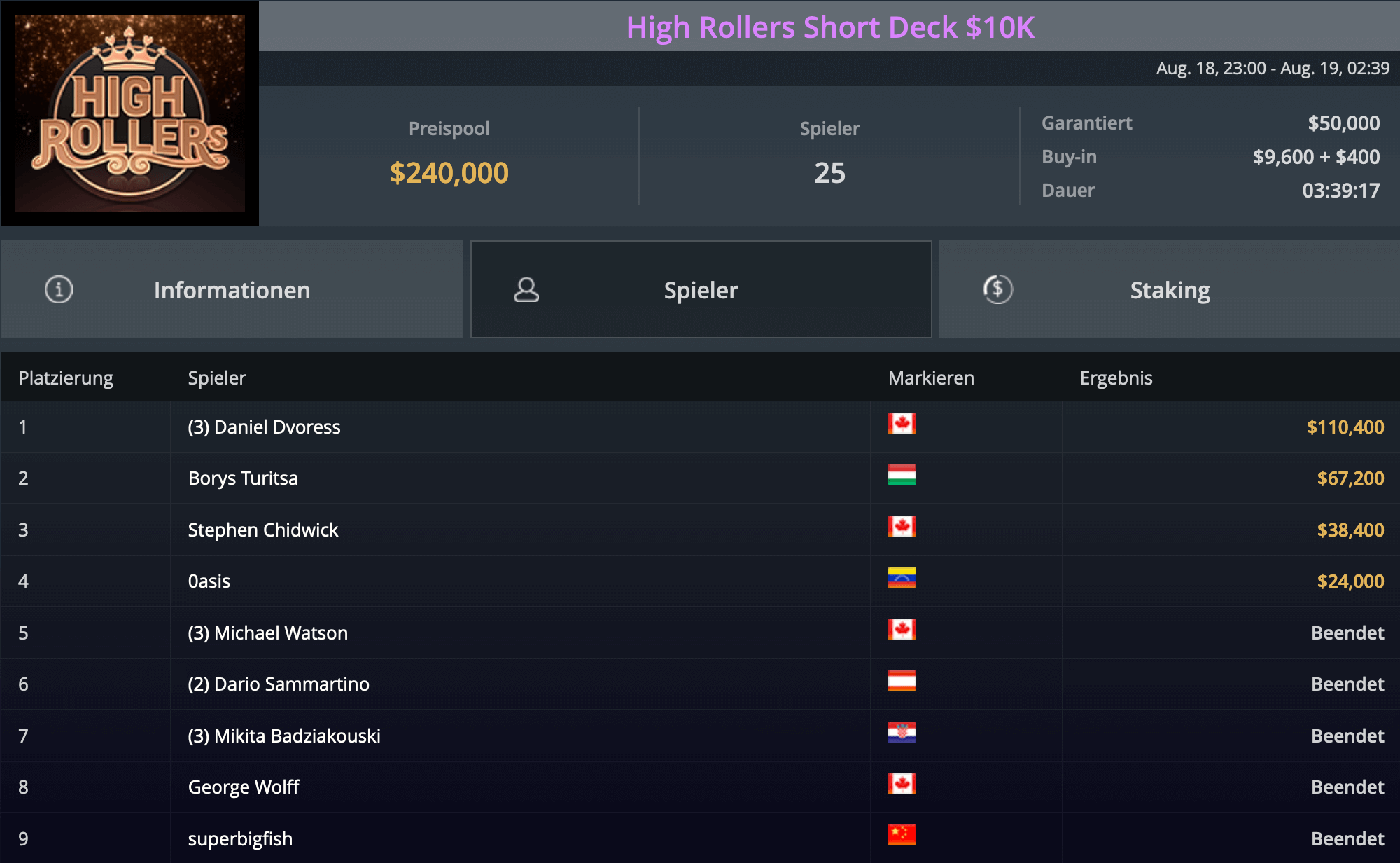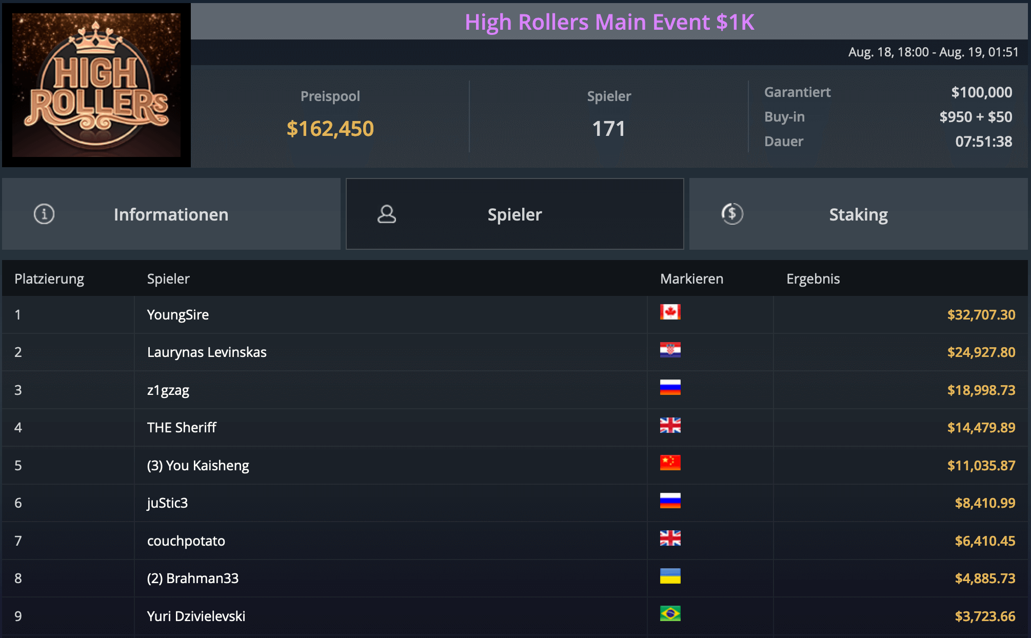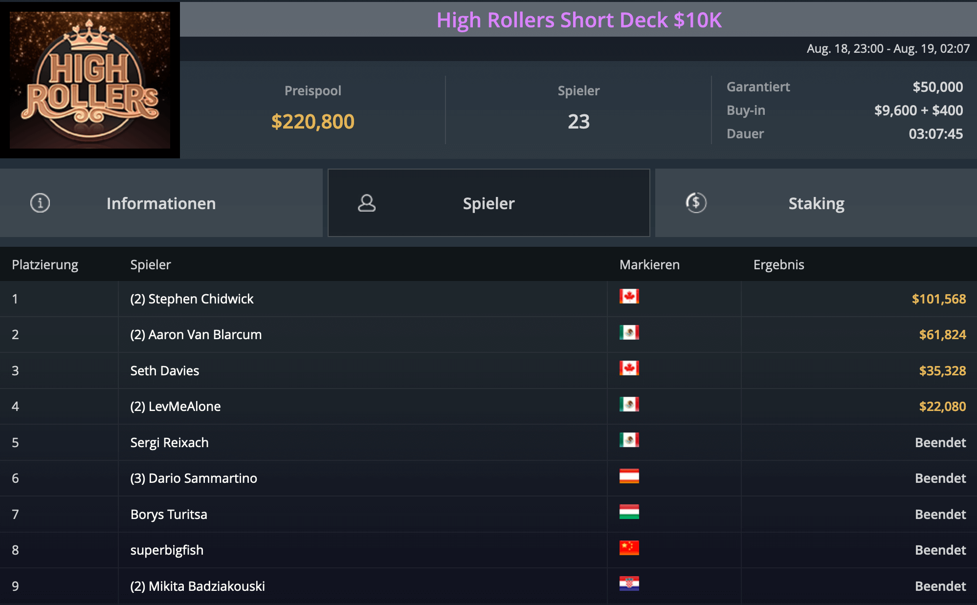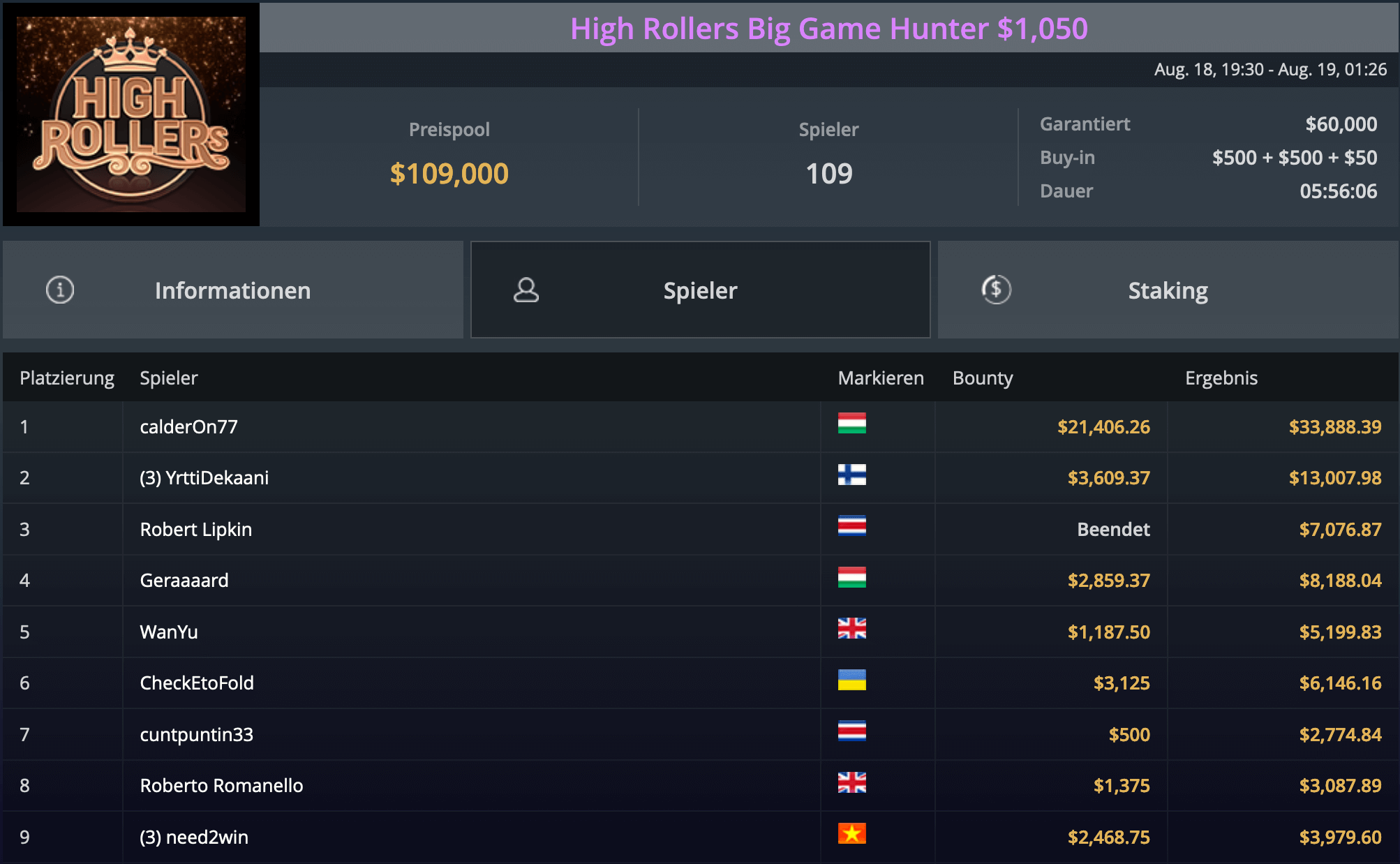 Weitere Ergebnisse auf GGPoker bei den High Rollers am 19.08.2020: