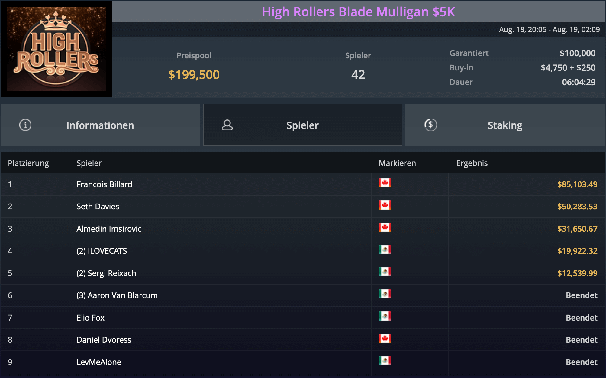 Beim $5.000 Blade Mulligan holte sich Francois Billard den Sieg für $85.103.